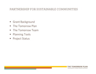 The document summarizes a regional planning grant for the greater Des Moines area in Iowa. The $2 million grant from the Partnership for Sustainable Communities involves 17 communities and aims to create a comprehensive long-term plan over 20 months. The plan will address socioeconomic, environmental and development issues and engage the public to establish a shared vision for sustainable growth.
