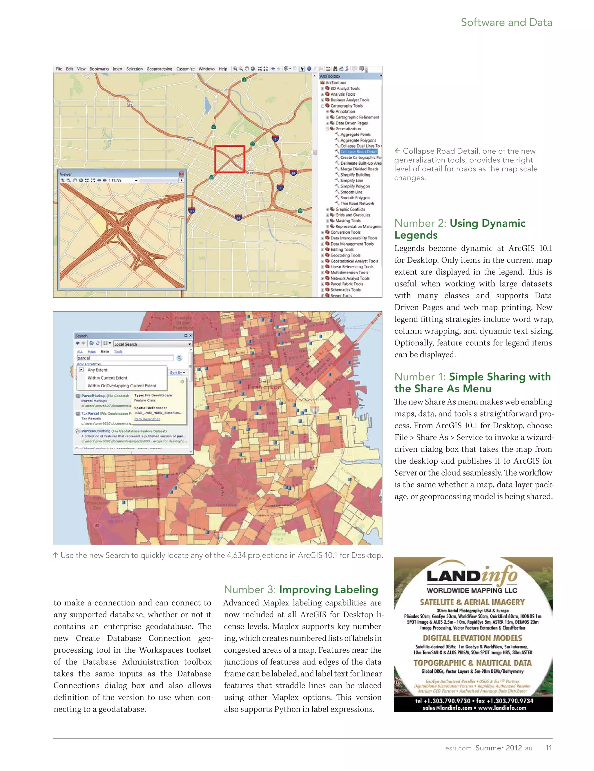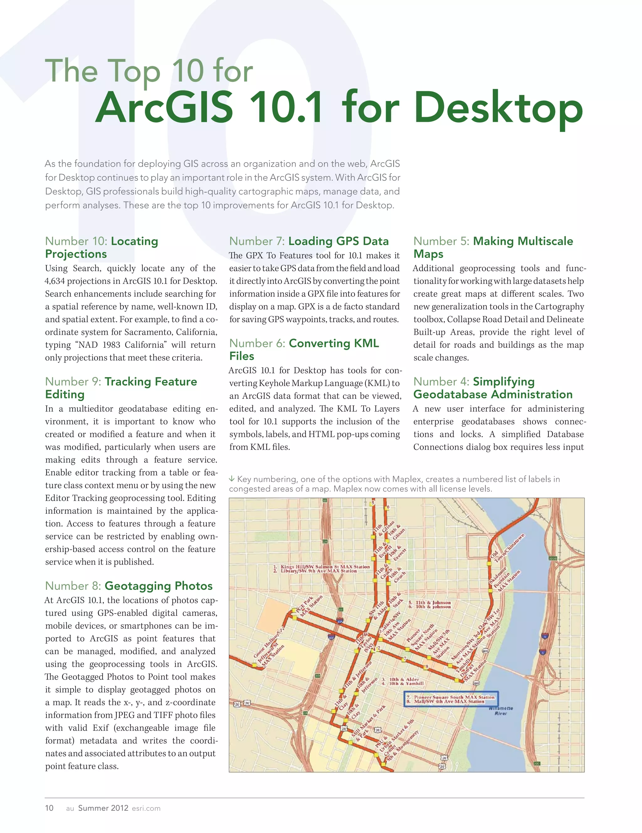 ArcGIS 10.1 enhances desktop GIS capabilities with ten key improvements, including easier GPS data integration, dynamic legends, and simplified editing. New tools enable better geocoding, data management, and cartographic design, such as the ability to convert KML files and geotag photos. The 'Share As' menu streamlines web-sharing processes for maps and data.
