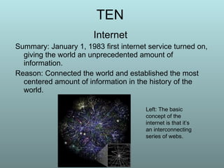 1. The document outlines 10 significant events in history, beginning with the creation of the internet in 1983 and ending with the atomic bombing of Hiroshima in 1945.