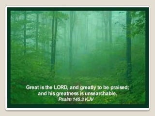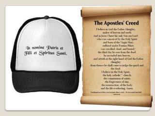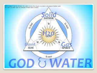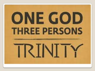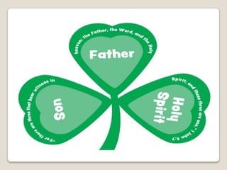 The document discusses the Catholic belief in the Trinity - that God exists as three persons (Father, Son, and Holy Spirit) in one God. It provides several analogies to help explain this doctrine, such as the shamrock which has three leaves but is one plant. The Trinity is not explicitly stated in the Bible but can be inferred from passages that reference God as plural or mention all three persons, like Jesus's baptism where God's voice acknowledges Jesus as his Son and the Holy Spirit appears as a dove. While the Trinity is a mystery that we cannot fully comprehend, it is central to Christian faith.