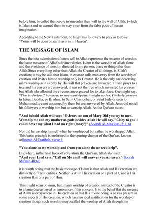 The document provides an overview of the key beliefs and messages of Islam. It begins by explaining that Islam means "submission to God" and was the religion of previous prophets like Adam and Abraham. The core message of Islam is the worship of Allah alone without any intermediaries. It contrasts this with false religions that claim God can be worshipped through idols or other creations. In conclusion, it asserts that the only purpose of human creation is to worship Allah alone.