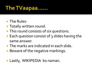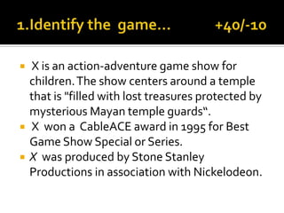 The document provides an overview of various television shows, including game shows and sitcoms, detailing their formats, themes, and historical significance. Key highlights include information on shows like 'X', 'Z', and 'The Big Bang Theory', along with their production details, awards, and character dynamics. Additionally, it outlines the rules for specific quiz rounds related to these shows.
