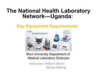 The document outlines key equipment requirements for various levels of health laboratories in Uganda, detailing specific needs for health center III, IV, general hospitals, and regional referral hospitals. Each section lists essential equipment types and quantities necessary to perform various diagnostic tests while adhering to specified biosafety levels. It also highlights the importance of proper laboratory management, equipment selection, and maintenance for effective healthcare service delivery.