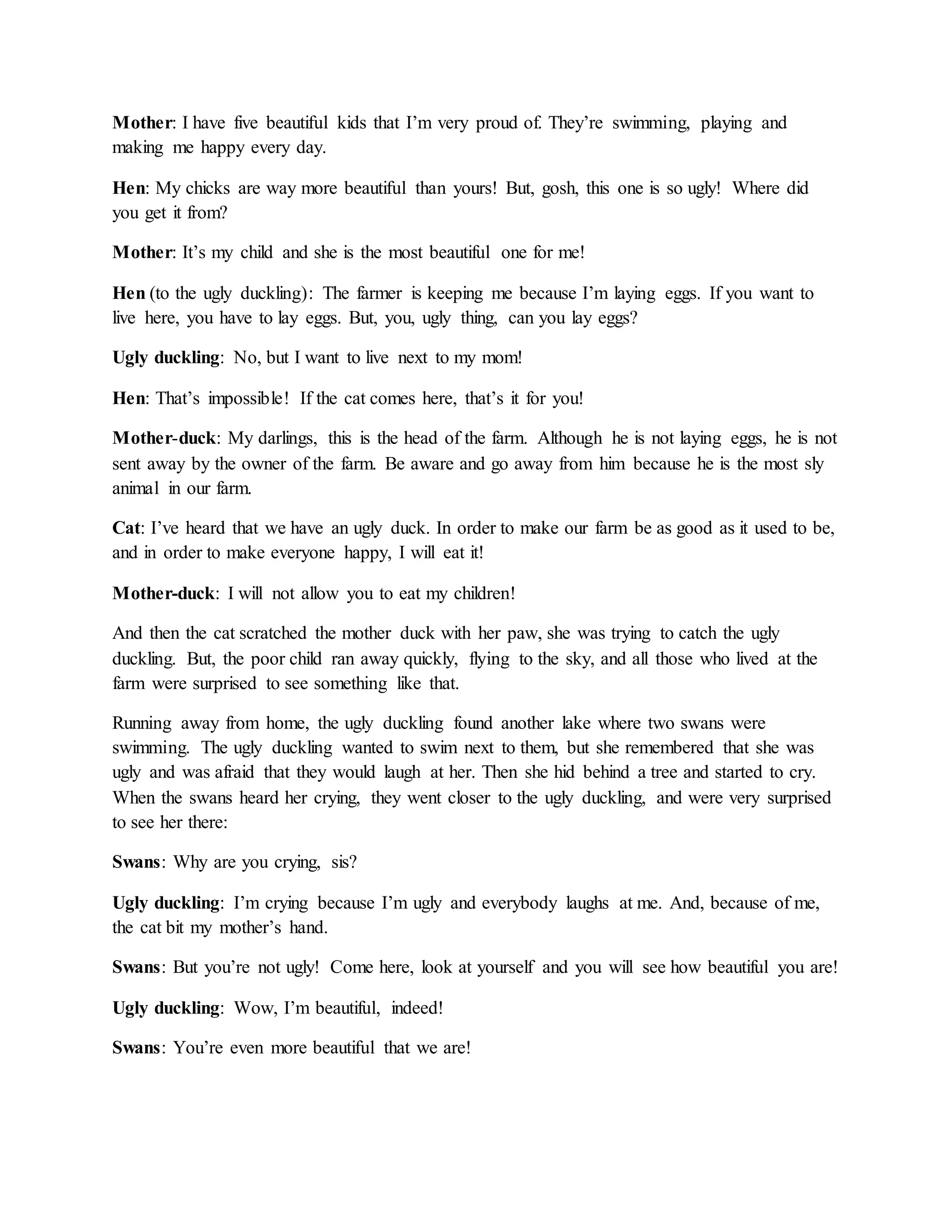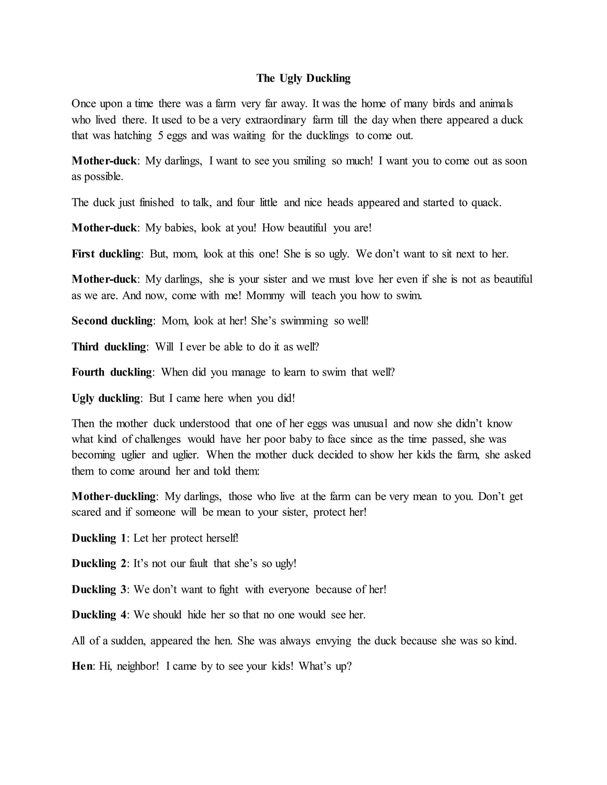 1) A mother duck hatched five eggs, but one duckling was much larger and uglier than the others.