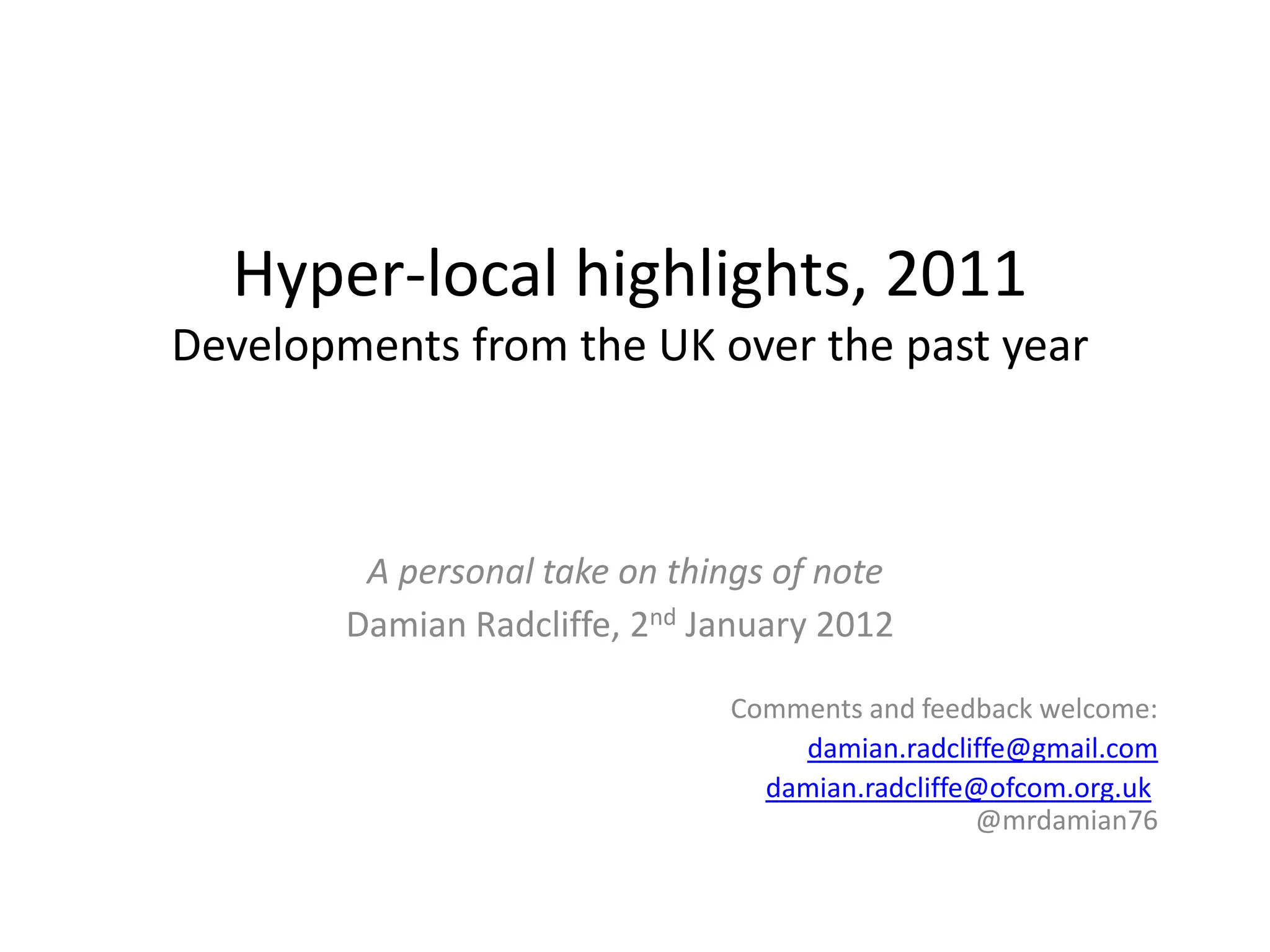 The document summarizes key hyper-local developments in the UK in 2011, including the growth of local TV, community radio, newspapers moving online, and challenges with funding models. Local TV licences were awarded, community radio continued expanding, and newspapers saw print declines but growth online. New models for local news are being tested, including advertising, franchising, and philanthropic funding.