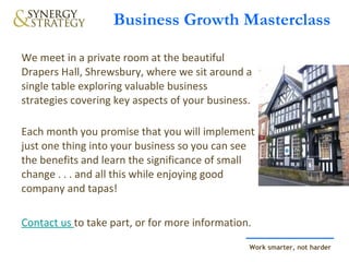 The document advertises a business growth masterclass for business owners. The masterclass covers various topics to help businesses grow, including developing a clear business vision and strategy, understanding customers and competitors, effective marketing, sales, finance, building a strong team, and exit planning. The monthly sessions are held over tapas at a private venue, and participants are asked to implement one thing each month in their business to see tangible results from the lessons.