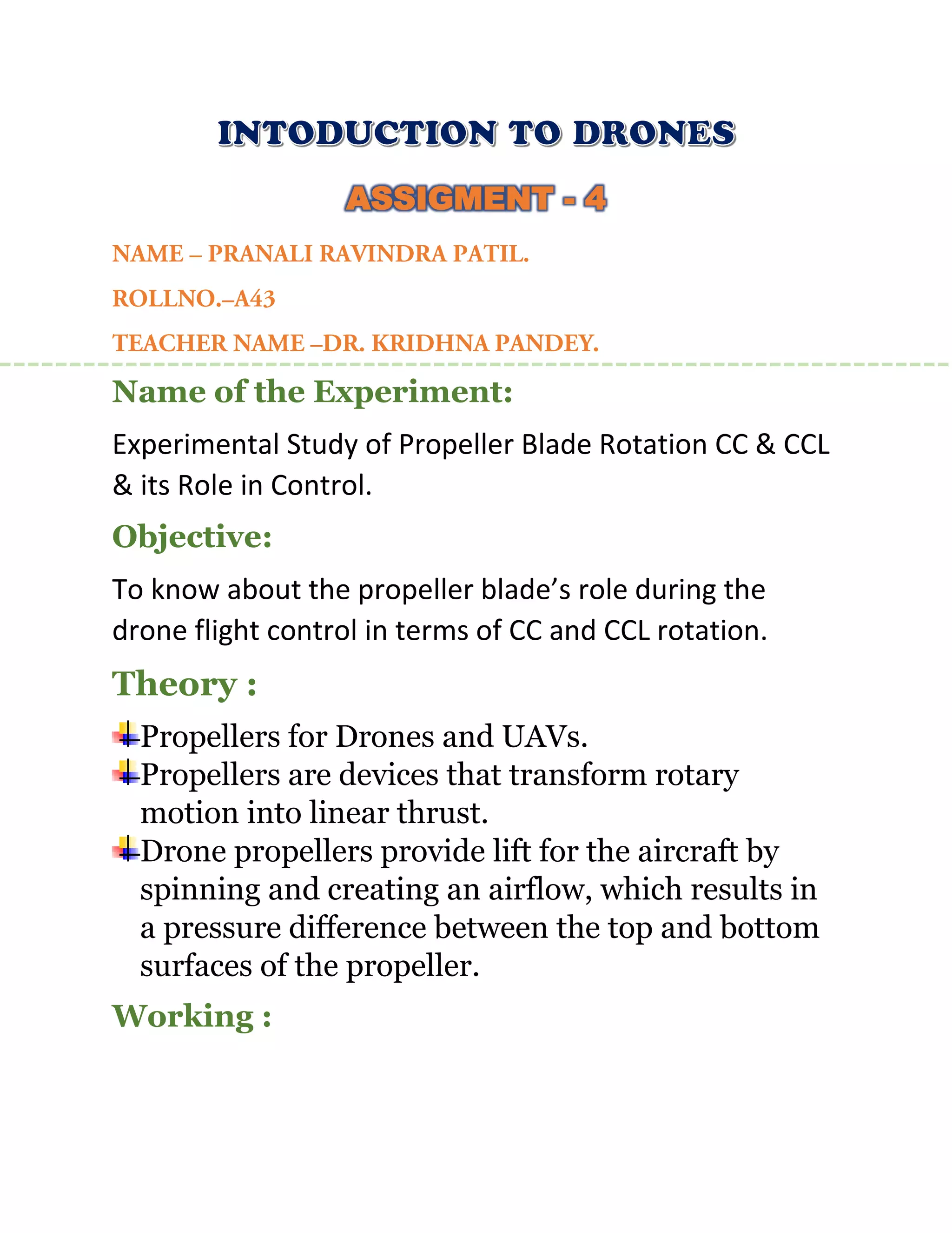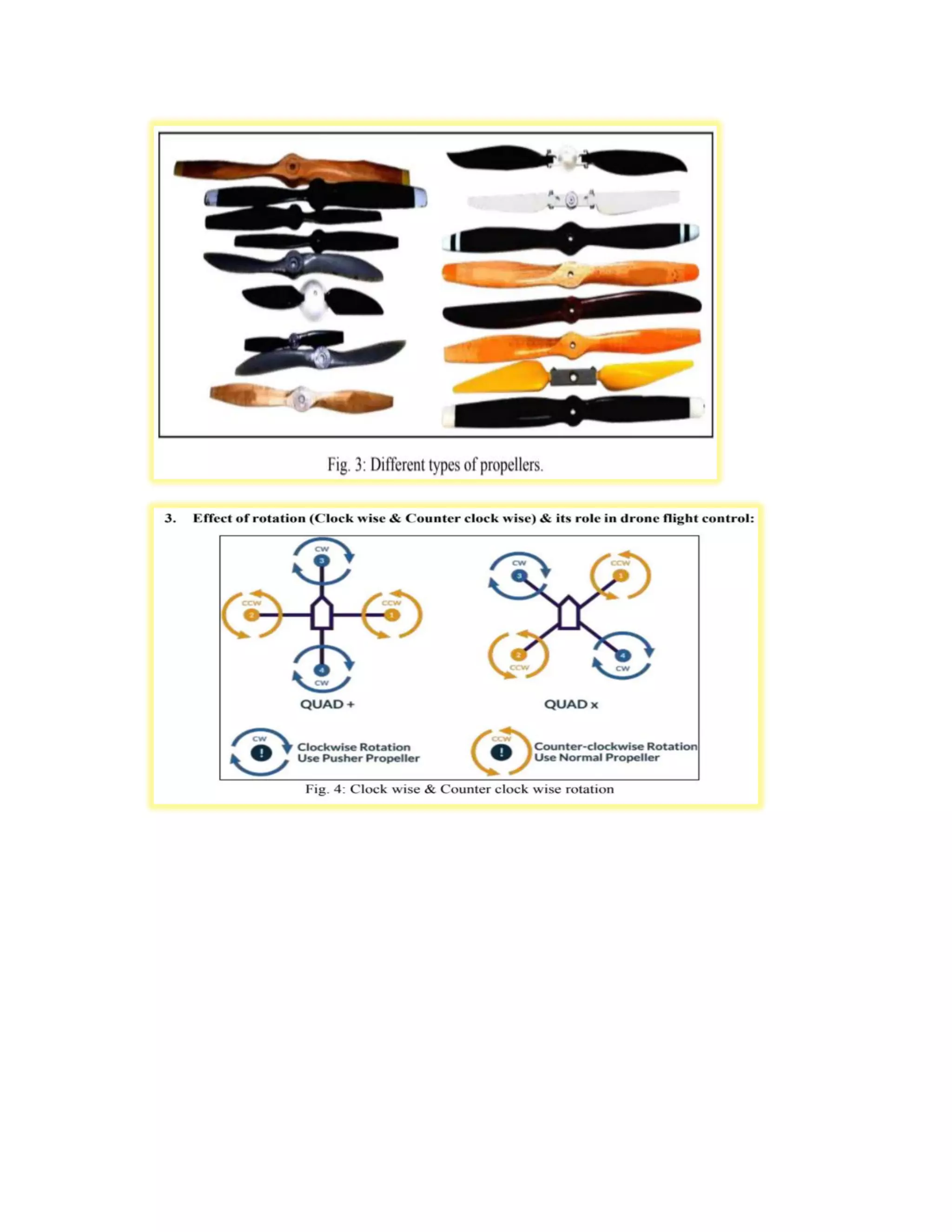 This experiment studied the role of propeller blade rotation in drone flight control. Specifically, it examined the effects of clockwise (CC) and counter-clockwise (CCL) rotation. The experiment tested how varying the speed of individual propeller motors allows drones to maneuver in different ways, such as taking off, landing, moving forward, backward, right, and left. It also explored how propeller blade shape, size, and construction materials like plastic or carbon fiber influence lift generation and flight performance. The results provide insight into how propeller rotation direction controls vertical and horizontal drone motion.