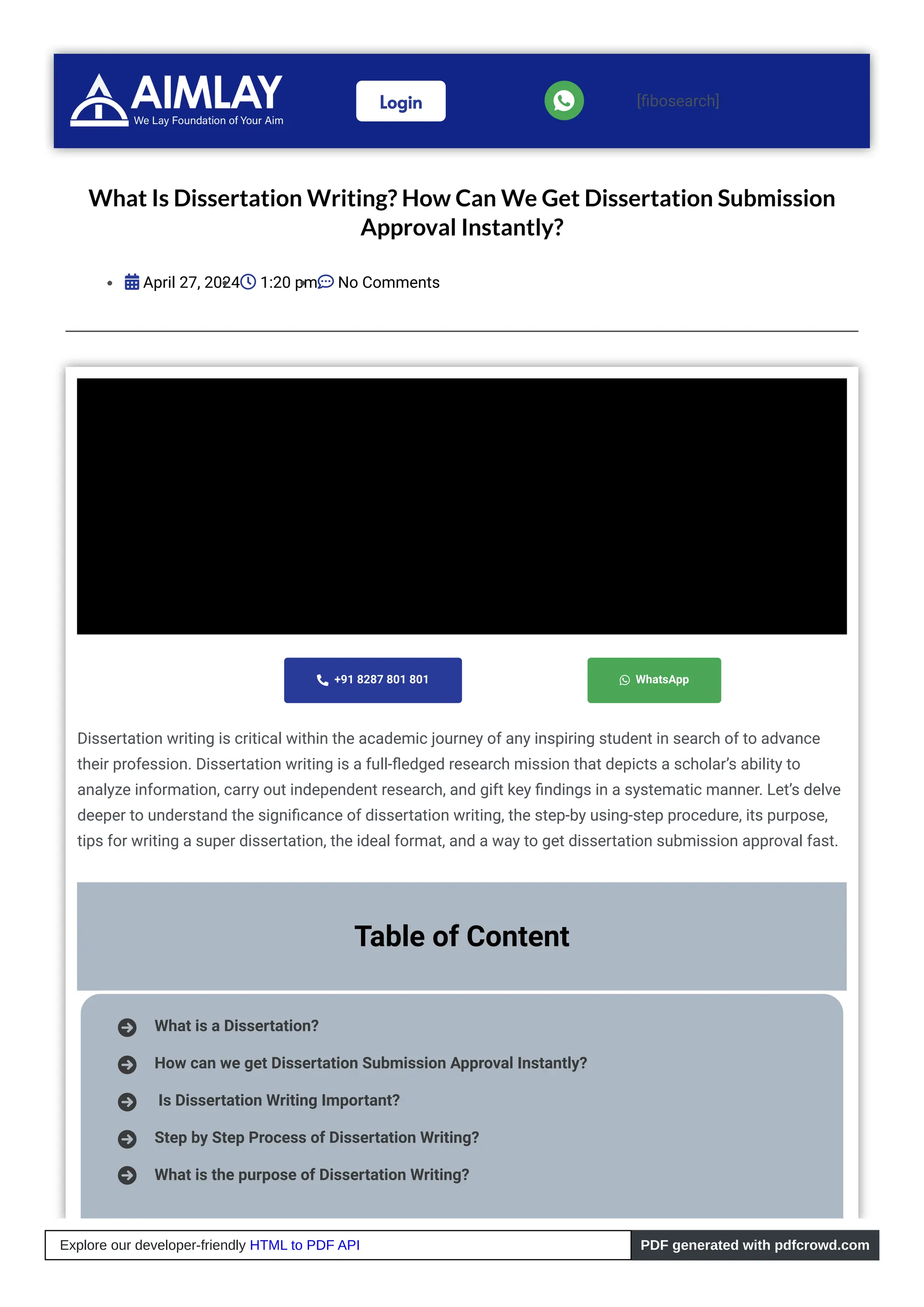 The document discusses the significance of dissertation writing as a major academic endeavor that demonstrates a scholar's research and analytical skills, typically required for doctoral degrees. It outlines the process for writing a dissertation, including topic selection, research, writing, and revision, while providing tips to facilitate instant submission approval. Additionally, it explains the purposes of dissertation writing, such as enhancing knowledge, academic recognition, and paving the way for career advancement.