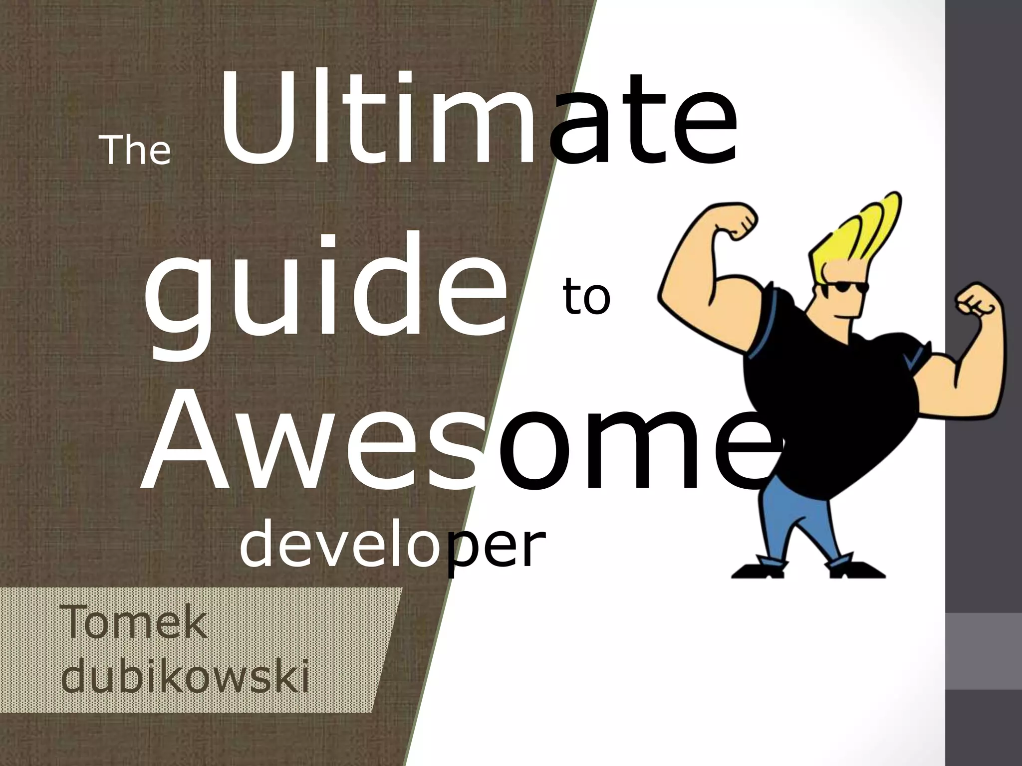 This document provides tips for becoming an awesome developer, including being responsible, transparent, proactive, and continuously improving. It advises identifying areas for growth, finding role models, observing others, and learning in order to progress, but warns against becoming too awesome. The overall message is about developing skills and maintaining a good work ethic and positive attitude.
