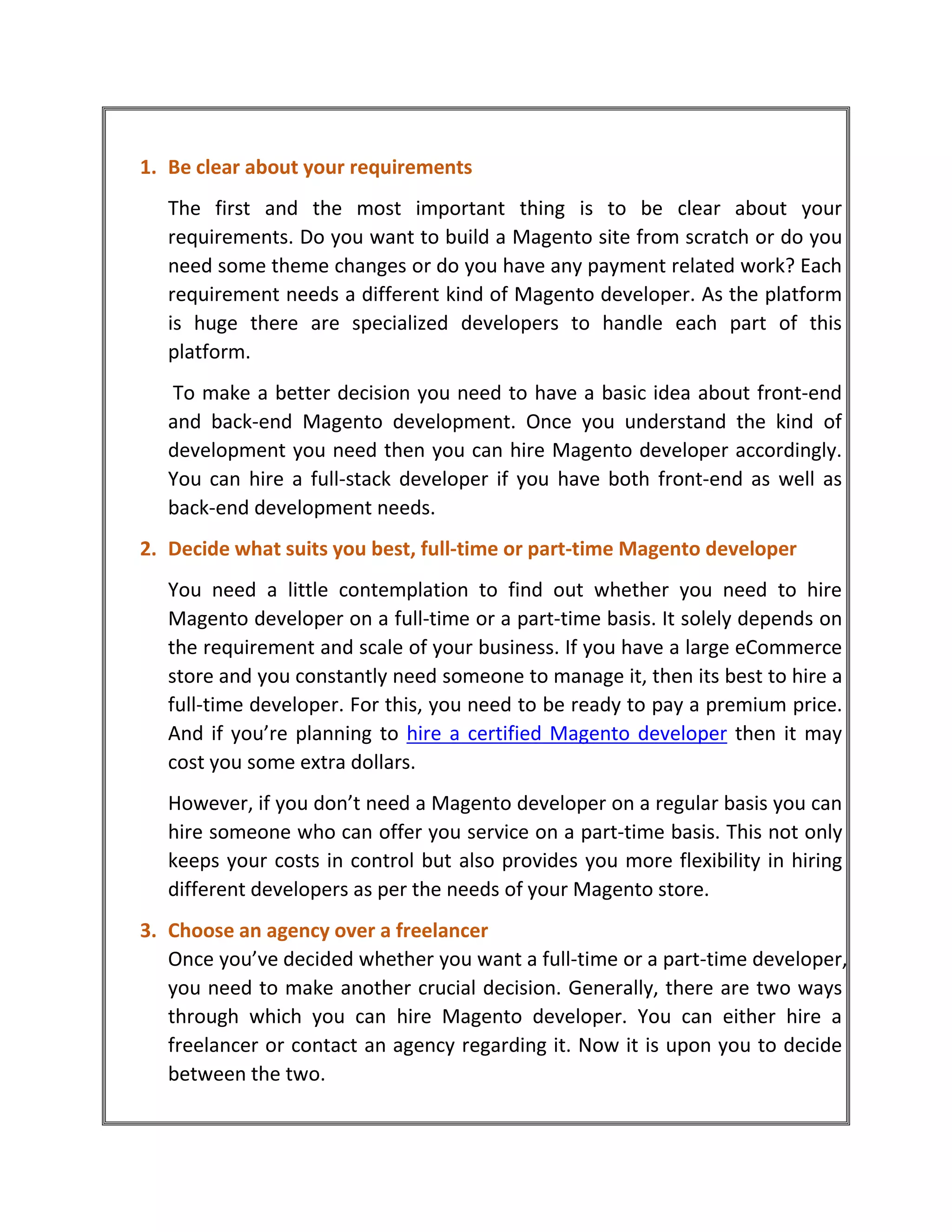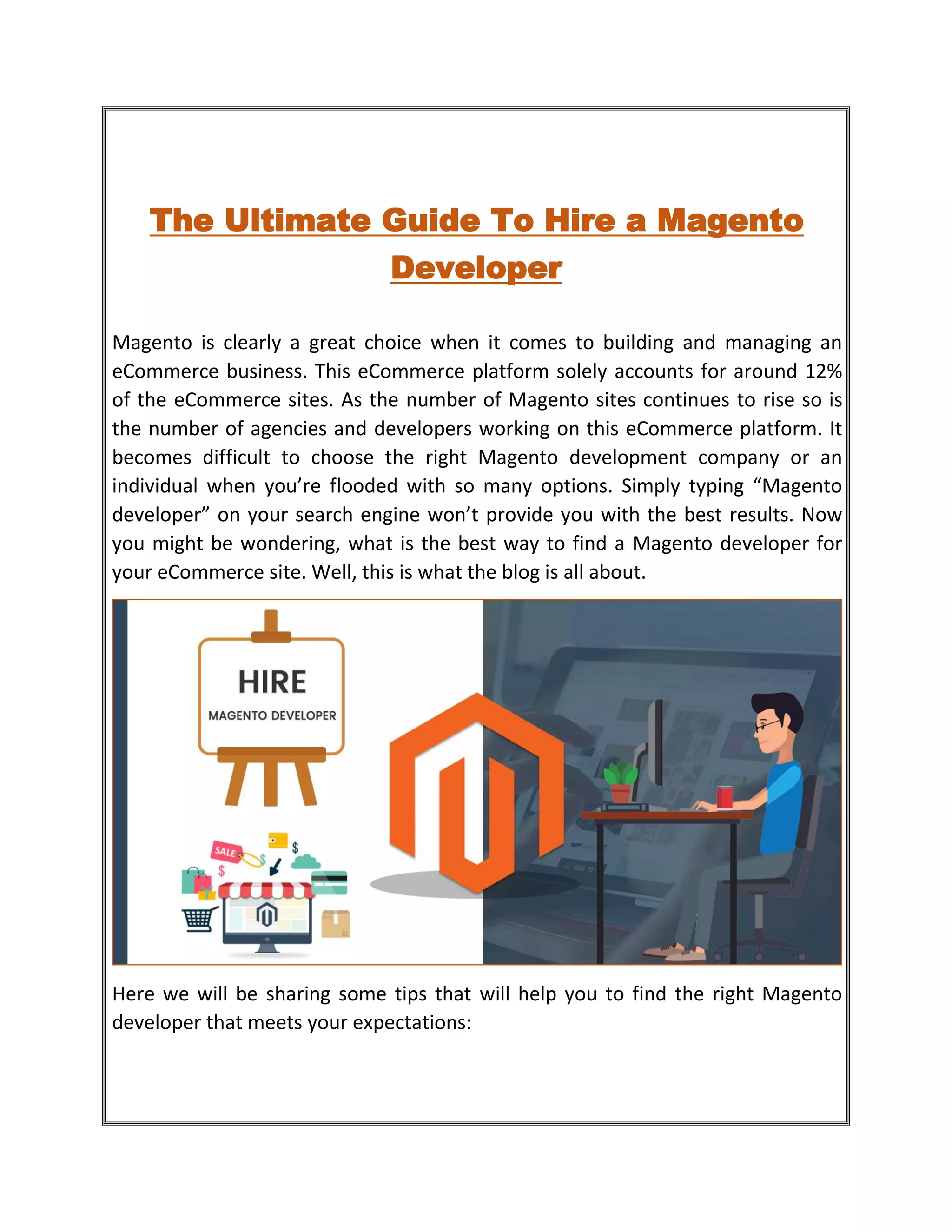 This guide provides essential tips for hiring a Magento developer to enhance your eCommerce site, highlighting the importance of clarity in your development requirements and choosing between full-time and part-time hires. It advises opting for an agency over a freelancer for long-term partnerships and emphasizes the necessity of reviewing portfolios and maintaining open communication. Ultimately, the quality of the developer significantly impacts your online store's performance.