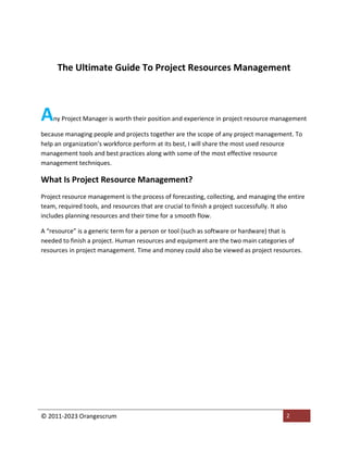 The document provides a comprehensive guide on project resource management, detailing processes such as forecasting, resource allocation, and performance monitoring to ensure successful project completion. It explains essential tools, techniques, and best practices, highlighting the importance of planning, evaluating, and optimizing resources while keeping project constraints in mind. Additionally, it emphasizes the role of software like Orangescrum in enhancing resource management efficiency.