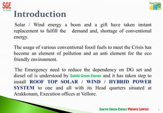 This document discusses installing a 5 KWp solar power system at a customer location to provide renewable energy. It outlines the system components, production estimates, costs, subsidies available, and installation process. The company promotes solar power as a way to save on electricity costs while helping the environment. Installation would take 3 weeks after receiving payment and subsidy approvals.