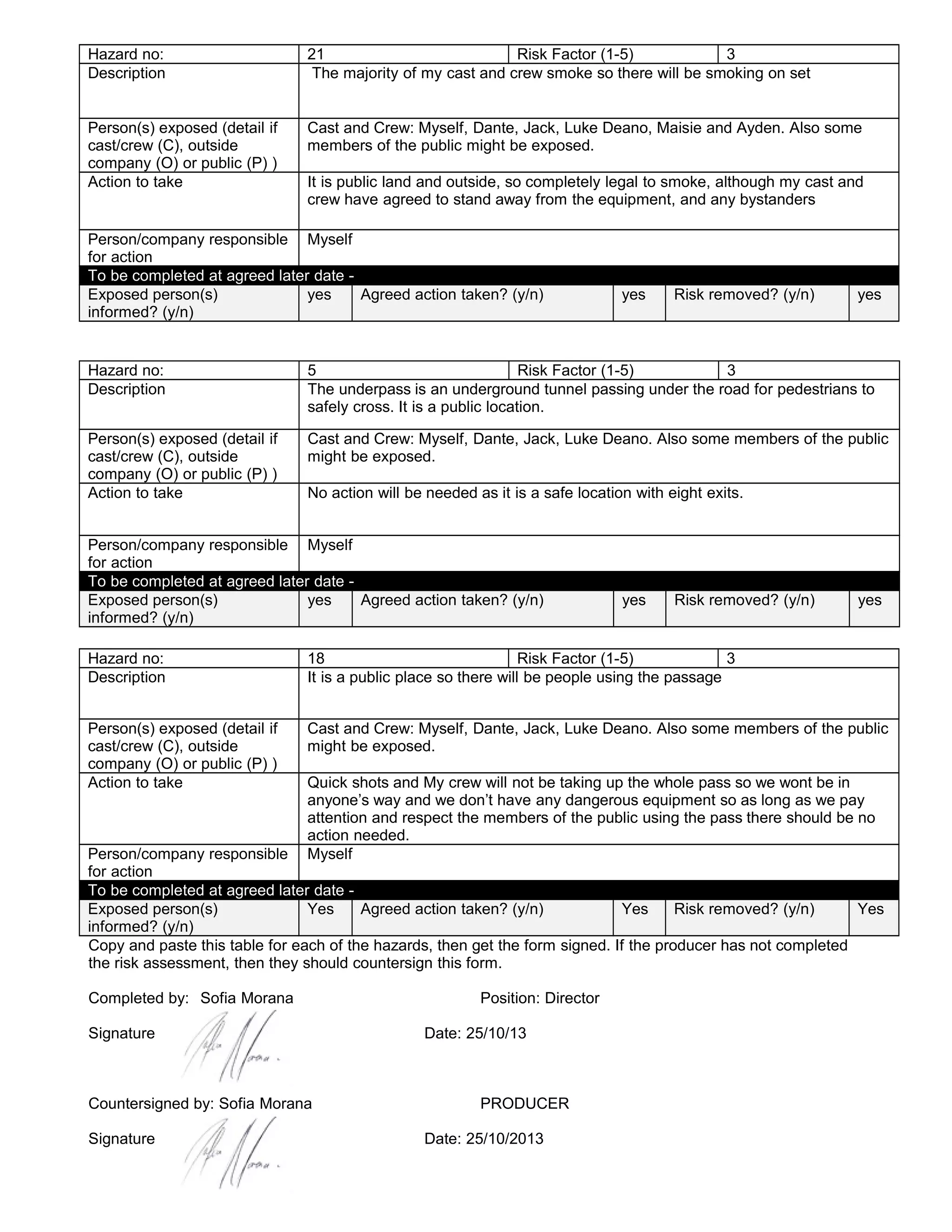 This document is a location risk assessment form for a music video shoot taking place on 30 October 2013 at a underpass in Norwich. It identifies three main risks: smoking by cast and crew, the underground location of the underpass itself, and the presence of members of the public at the public underpass location. For each risk, it identifies the affected parties, proposed actions to mitigate the risks, and signatures confirming review and agreement of the risk assessment.