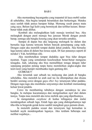 1. Gladis bertemu dengan cowok bernama J di bus yang sedang dalam perjalanan pulang ke Cilegon. 2. J ternyata ikut turun di Cilegon karena tersesat dan meminta Gladis untuk mengantarnya. 3. Dengan berat hati Gladis setuju asalkan J yang membayar ongkosnya, tetapi J justru meminta untuk menginap di rumah Gladis karena sedang kabur dari rumah.