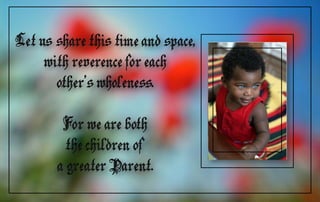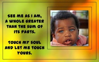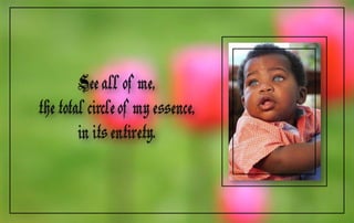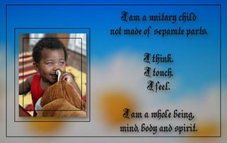 The child sees themselves as a unitary being, a reflection of the present and past who will link the now with the future. They view themselves as a unique individual, a bit of cosmic dust in the universe. The document advocates revering children for who they are in the present moment rather than by external factors.