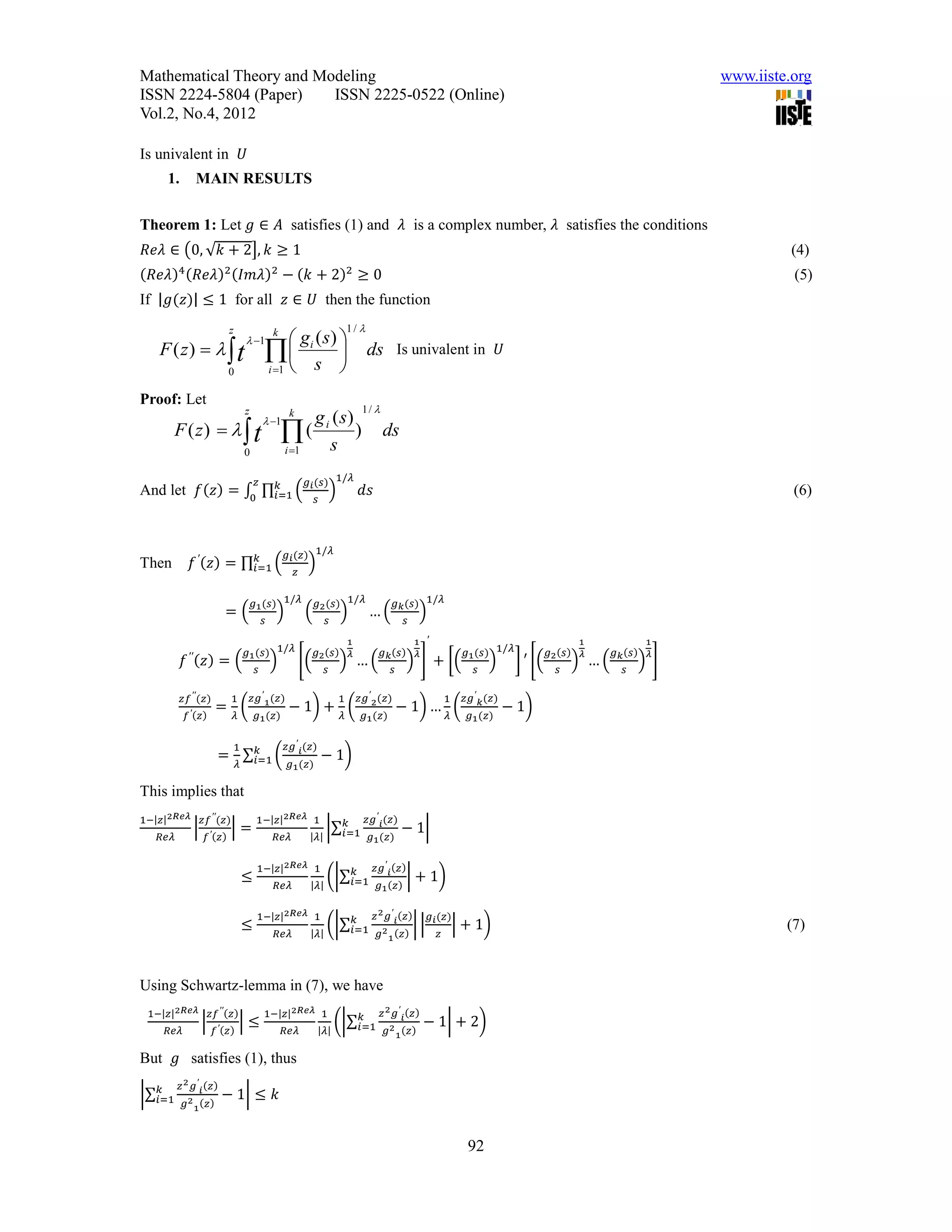 1) The document presents theorems for determining the univalence of integral operators of certain forms. Specifically, it obtains conditions for the univalence of operators of the form F(z) and H(z), which involve integrals involving functions g(s) that satisfy certain constraints.