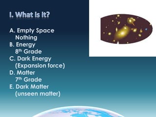 The document discusses the size and composition of the universe. It begins by defining what the universe contains, including empty space, energy, dark energy, and matter. It then explains the Big Bang theory, how the universe began as an incredibly small, dense point approximately 13.7 billion years ago and has been expanding ever since. It provides examples of scientific notation used to measure the vast distances within the universe from Earth to other galaxies. The document concludes by discussing potential futures of the universe, whether it will expand forever or potentially collapse back on itself in a "Big Crunch."
