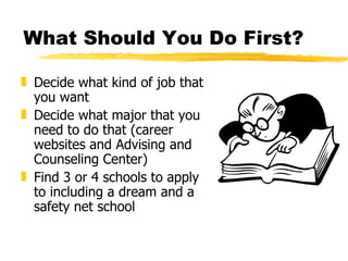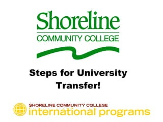 This document provides steps and guidance for university transfer students. It recommends deciding on a career path and major, then researching 3-4 schools including a "dream" and "safety" option. It outlines applying as a junior with 90+ transferable credits, and lists application deadlines ranging from November to April. Requirements include transcripts, English proficiency tests, statements, and fees. Maintaining grades and starting the process early is advised. Campus resources and advising are available to assist through the transfer process.