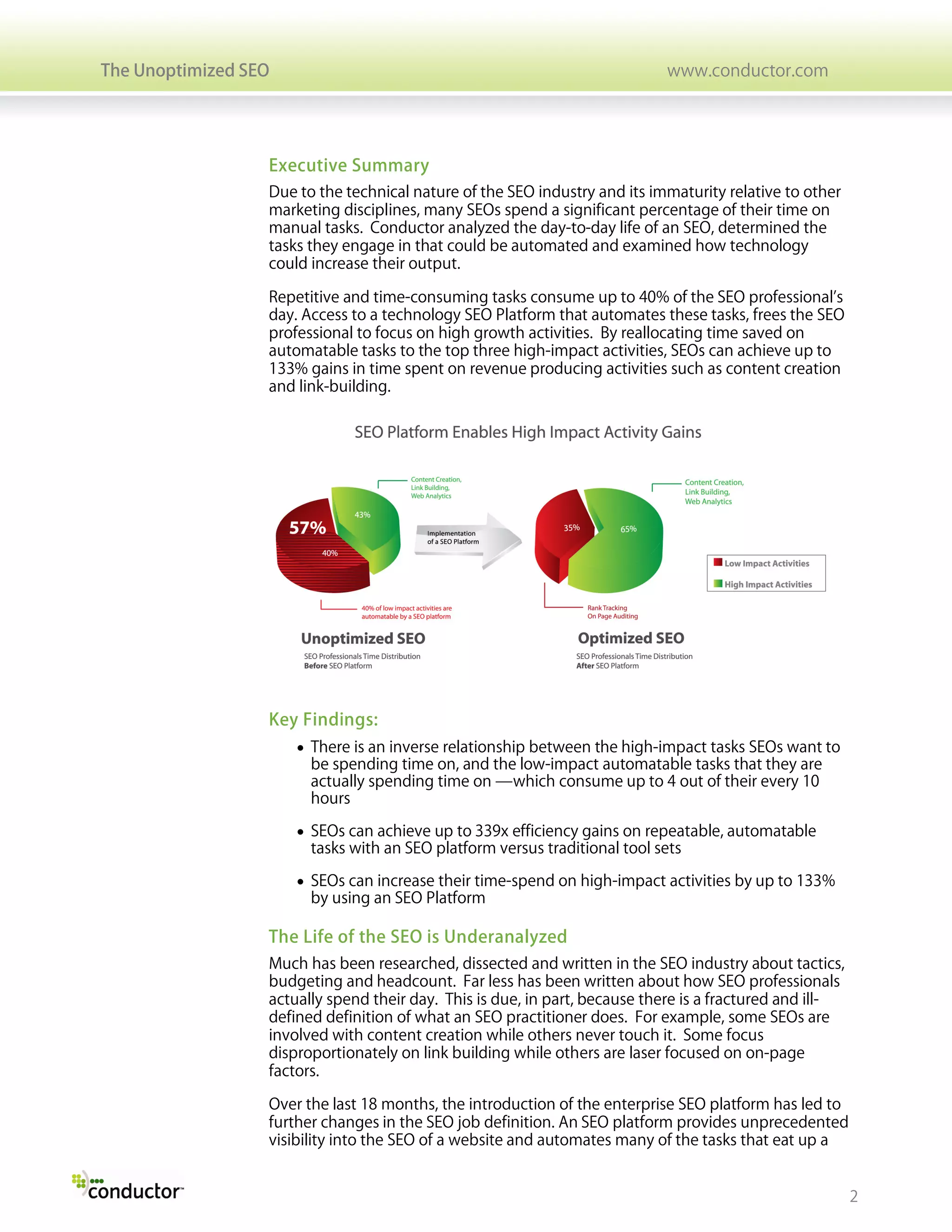 The document explores how manual tasks hinder the effectiveness of SEO professionals, with up to 40% of their time spent on low-impact activities that could be automated. By leveraging an SEO platform, these professionals can achieve significant efficiency gains, reallocating time to high-impact tasks such as content creation and link-building, resulting in potential time increases of up to 133%. The study highlights the urgent need for automation in SEO to improve productivity and focus on strategic activities that enhance search visibility.