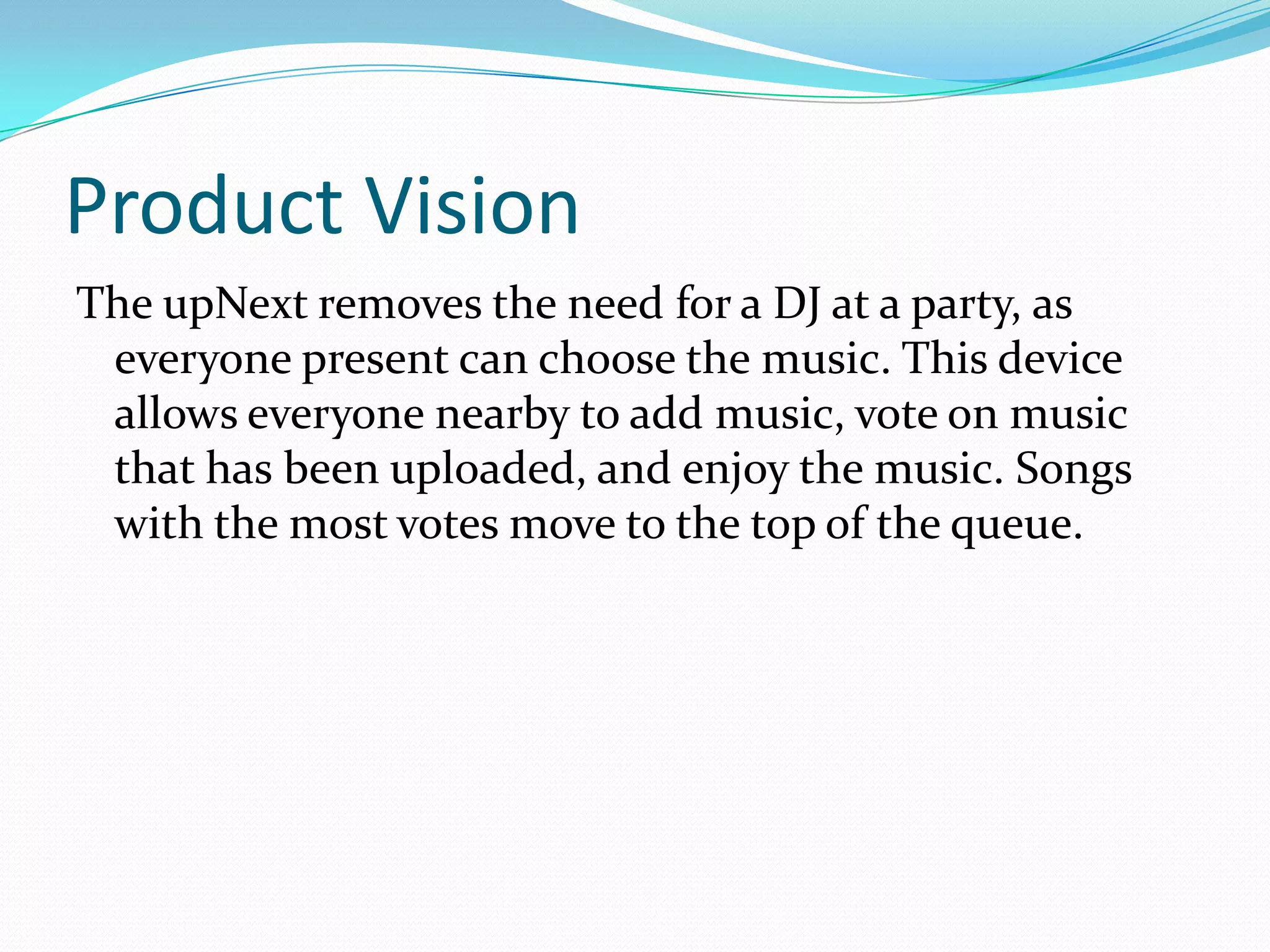 The document describes a device called the upNext, which allows party guests to choose and vote on music played through a stereo system by uploading songs from their smartphones and other devices to a Raspberry Pi-based prototype. The target audience is college students who host parties but can't agree on music selection. Users transfer music files without wires via a WiFi network, and songs with the most votes move to the top of the queue. Development challenges included issues with an intended MP3 decoder chip.
