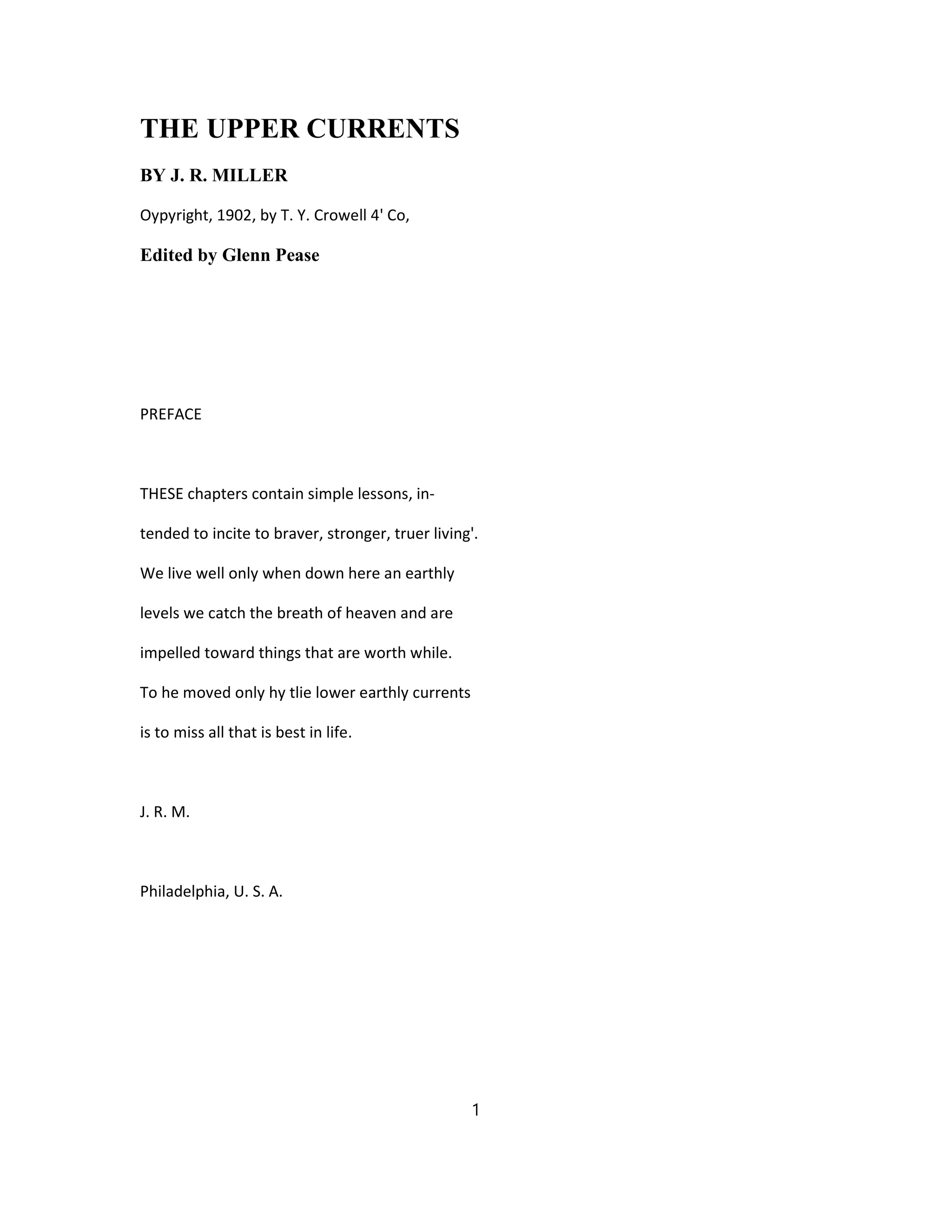J.R. Miller's "The Upper Currents" promotes living a life influenced by divine love and higher principles rather than solely by earthly concerns. The text emphasizes the importance of starting each day with God, aiming for uplifting relationships, and helping others by fostering their spiritual growth rather than merely meeting their immediate needs. It advocates for intentional living that seeks to inspire and elevate both oneself and those around them.