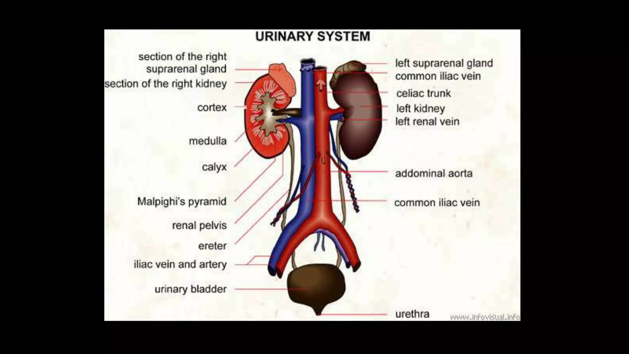 The kidney functions to regulate osmolarity, remove metabolic waste, and produce hormones. It contains nephrons which filter blood to form urine. Each nephron includes a renal corpuscle and renal tubule. The renal corpuscle contains the glomerulus and Bowman's capsule. The renal tubule is made of several segments that modify the filtrate through reabsorption, secretion, and other processes. Urine exits the kidneys through the ureters to the urinary bladder and urethra to be excreted from the body.