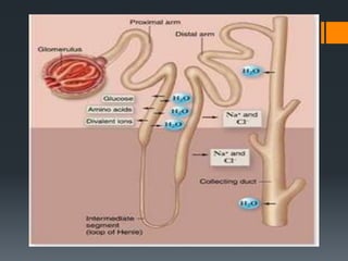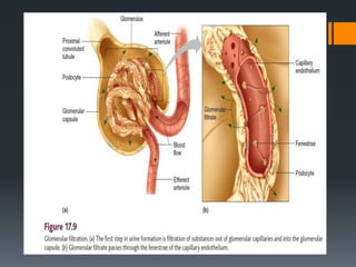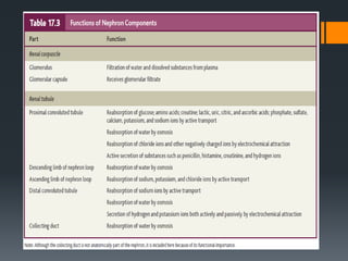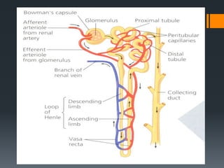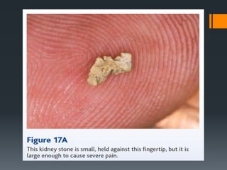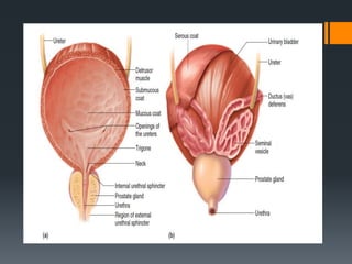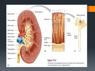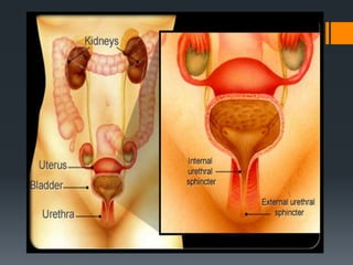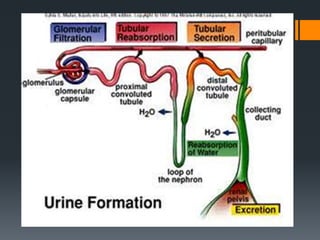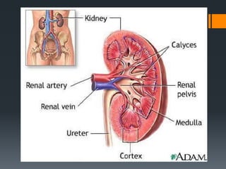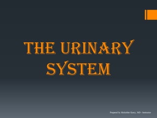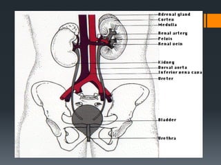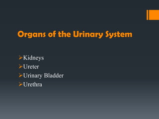 The urinary system consists of the kidneys, ureters, urinary bladder, and urethra. The kidneys filter the blood to remove wastes and produce urine. The urine travels from the kidneys down the ureters into the urinary bladder, where it is stored until emptying through the urethra. The nephrons are the functional units of the kidney that filter the blood and regulate water and electrolyte balance to produce urine and maintain homeostasis. Common disorders of the urinary system include renal failure, cystitis, kidney stones, and urinary incontinence.