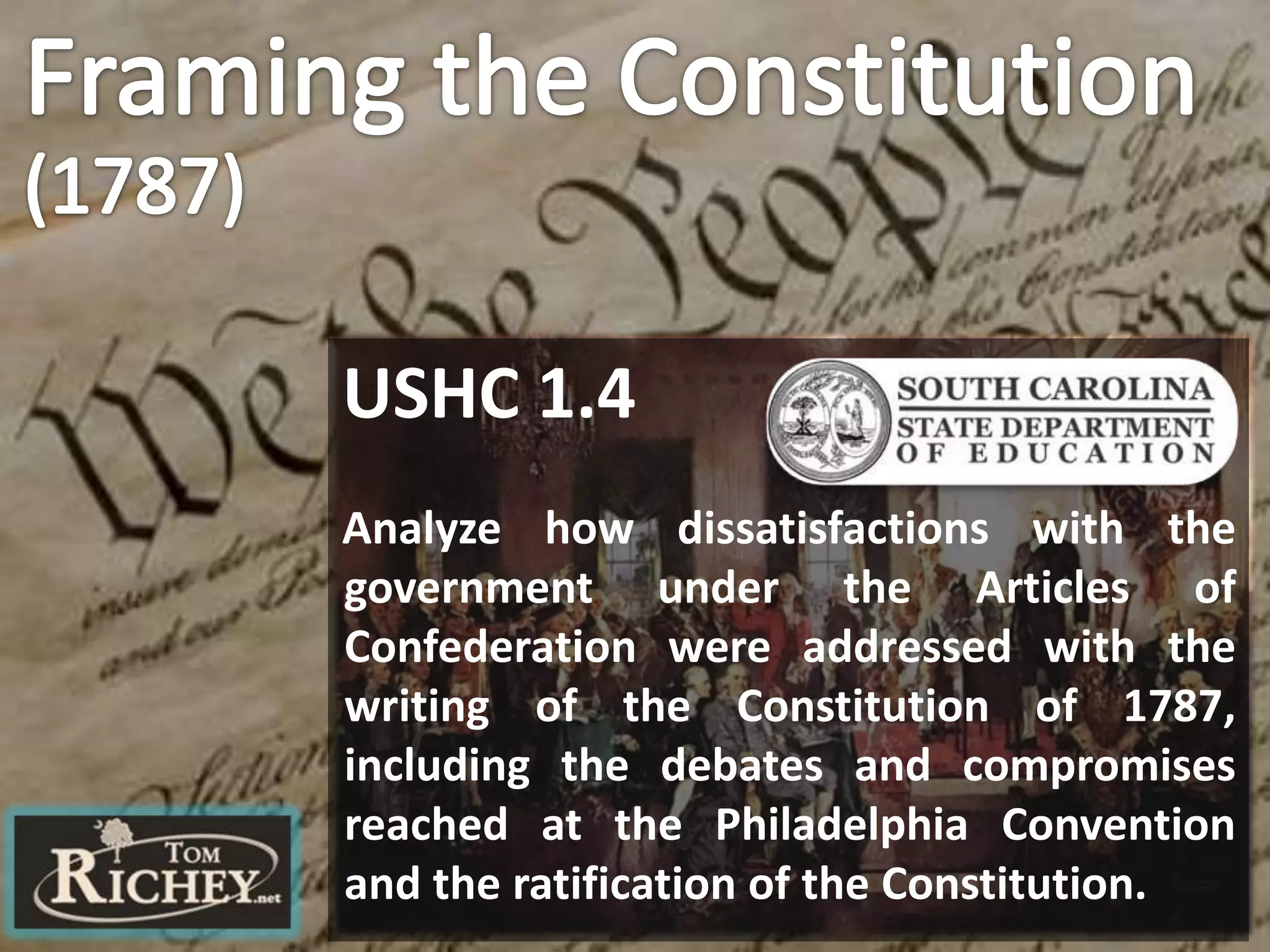 The document outlines the framing and ratification of the U.S. Constitution, emphasizing the dissatisfaction with the Articles of Confederation and the compromises made during the Philadelphia Convention, including the Virginia and New Jersey Plans. It discusses the key principles of limited government as safeguarded by the Constitution and the Bill of Rights, highlighting federalism, separation of powers, and checks and balances. Additionally, it covers the ratification debates between Federalists and Anti-Federalists, the various states' approval processes, and the importance of the Bill of Rights.