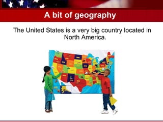 The document provides information about geography, demographics, languages, government, and symbols of the United States. It discusses that the US is located in North America between the Pacific and Atlantic oceans, bordered by Canada and Mexico, with over 312 million residents. English and Spanish are the most common languages. The president is Barack Obama and the currency is the US dollar. Famous symbols include the American flag, Statue of Liberty, bald eagle, and the White House.