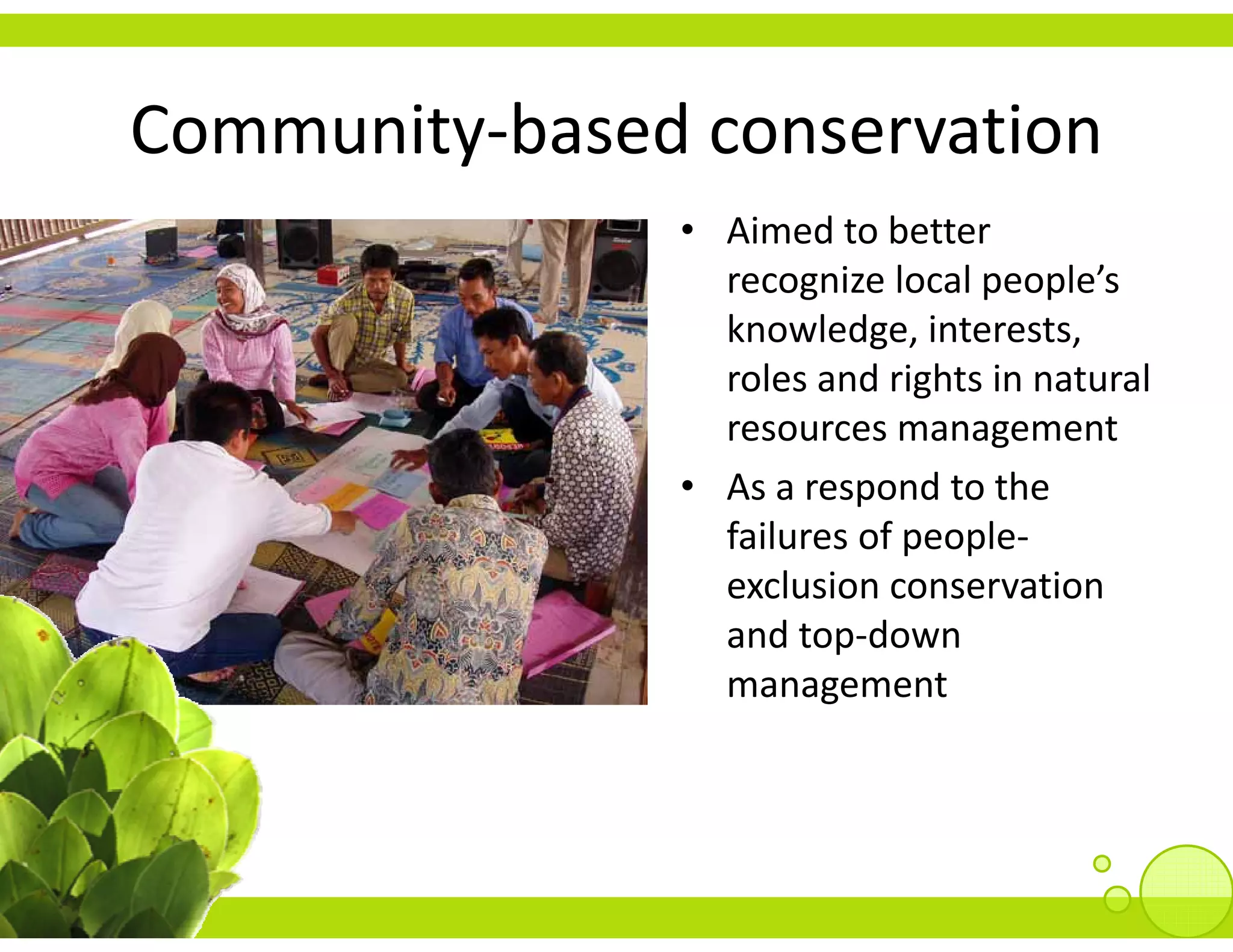 The document discusses innovative learning approaches to enhance community-based conservation (CBC) by emphasizing local knowledge, trust-building, and empowerment over top-down management. It highlights the challenges of project dependency and inadequate representation in conservation efforts, advocating for inclusive processes that foster resilience and creativity. Successful implementation relies on flexible facilitation and the integration of traditional ecological knowledge, ultimately leading to sustainable practices and stronger community engagement in environmental stewardship.