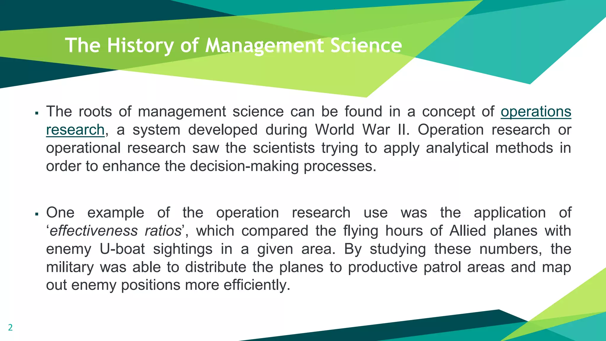 The document discusses the history and concepts of management science. [1] Management science originated from operations research during World War 2 to apply analytical methods to decision making. [2] It uses tools from fields like economics, mathematics, business administration and psychology to examine organizations and find ways to improve productivity and efficiency. [3] The key is viewing management logically and quantifying problems to solve them using models, simulations and other mathematical techniques.