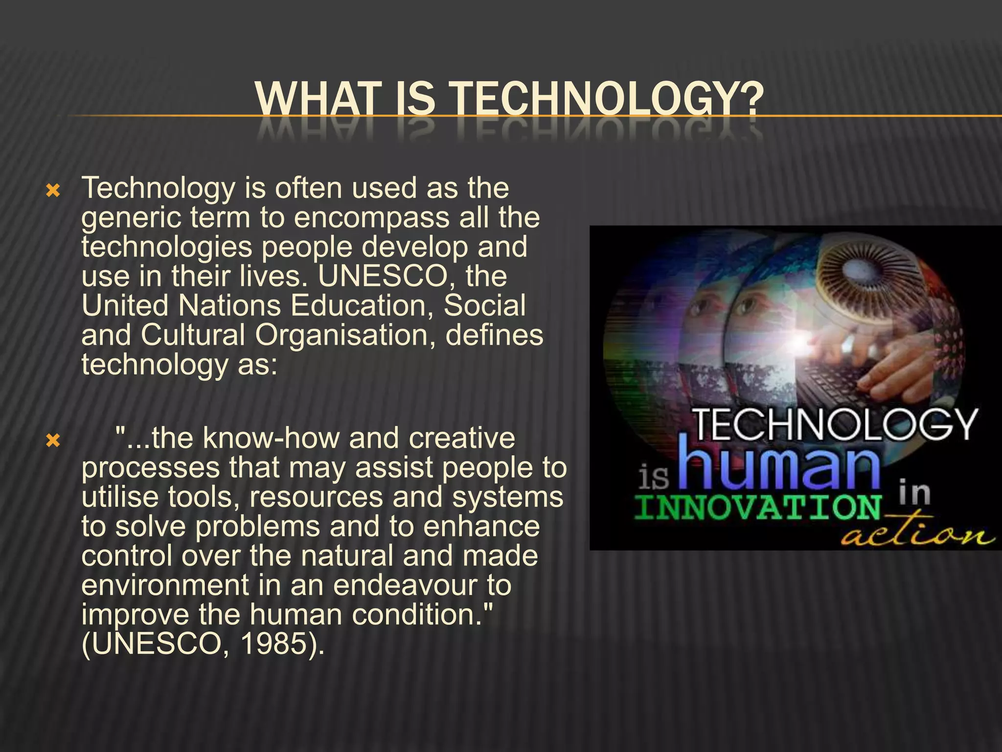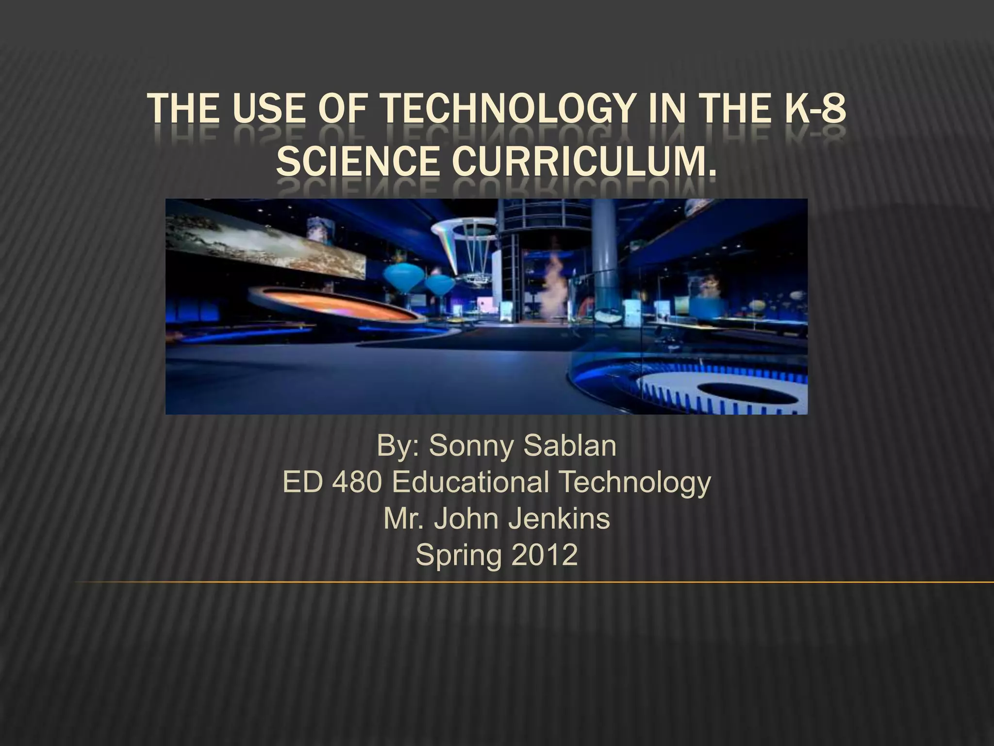 This document discusses the use of technology in K-8 science curriculums. It defines technology and curriculum, and explains that technology should be integrated in a way that supports curricular goals through active engagement, participation, interaction, and real-world connections. It provides guidelines for introducing technology in science teacher preparation and discusses how technology can enhance science learning. Specific examples are given of how technology can significantly change student and teacher roles and increase motivation, collaboration, and use of resources. The document concludes by discussing how to integrate technology into a science classroom.