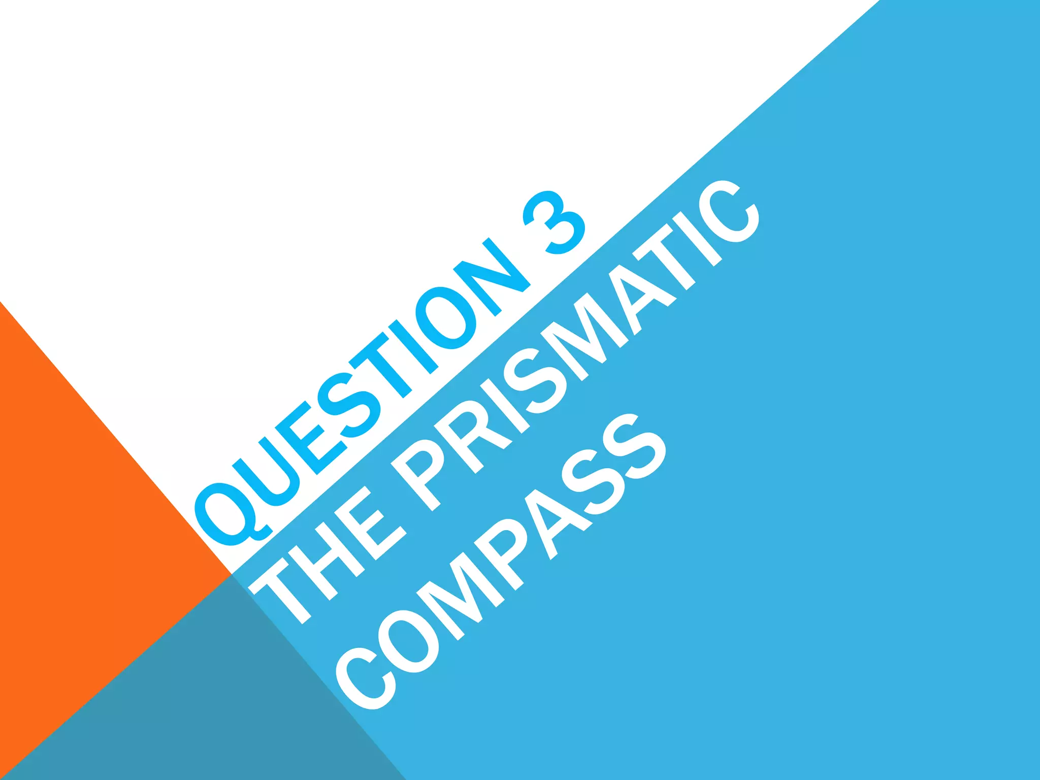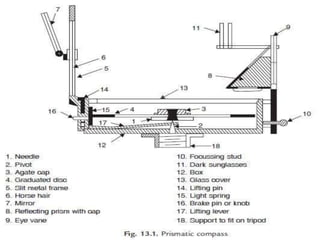 The document describes the components and uses of a prismatic compass. It details the cylindrical metal box, pivot, lifting pin and lever, spring brake, magnetic needle, graduated circle, prism, object vane, eye vane, sunglasses, and reflecting mirror that make up the prismatic compass. It then explains that the prismatic compass is a small, handheld instrument used for observing and rough work, and that its prismatic attachment contains a 45 degree reflecting prism to magnify the graduations and allow the user to take readings.