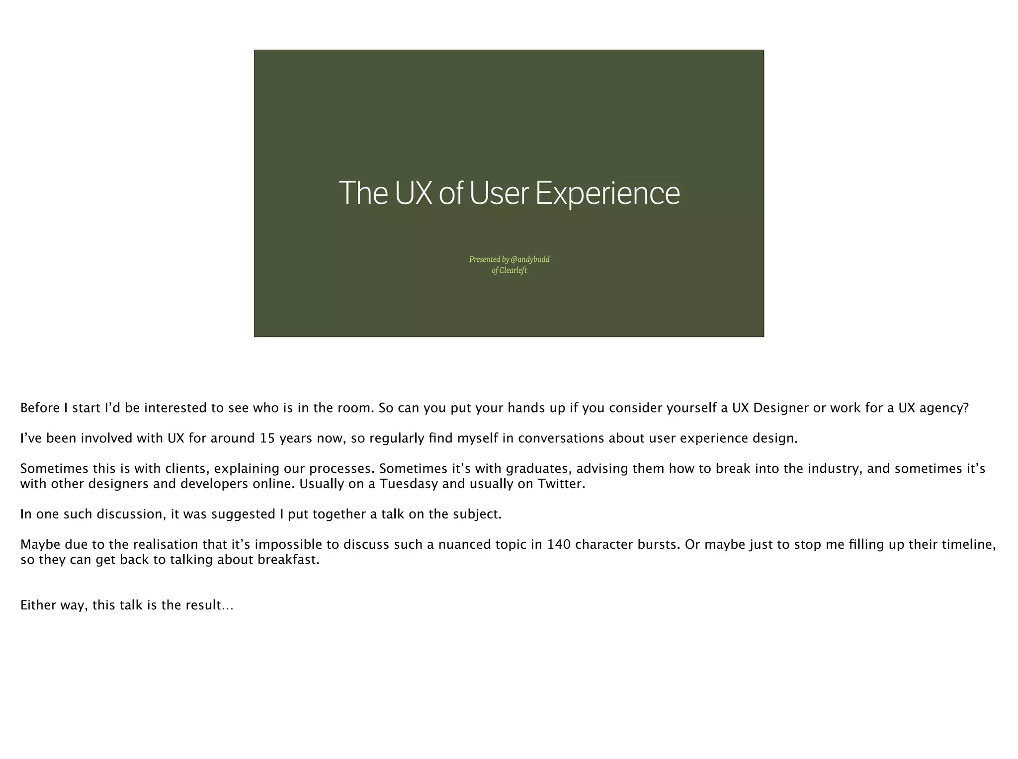 The document discusses misconceptions about user experience (UX) design, emphasizing the oversimplification of UX as merely wireframing or documentation. It critiques the marketing of UX roles and highlights the complexity and depth of the field, referencing influential figures in UX history. Additionally, it urges a re-evaluation of UX professionals and the importance of viewing design as a holistic practice rather than a marketing tool.