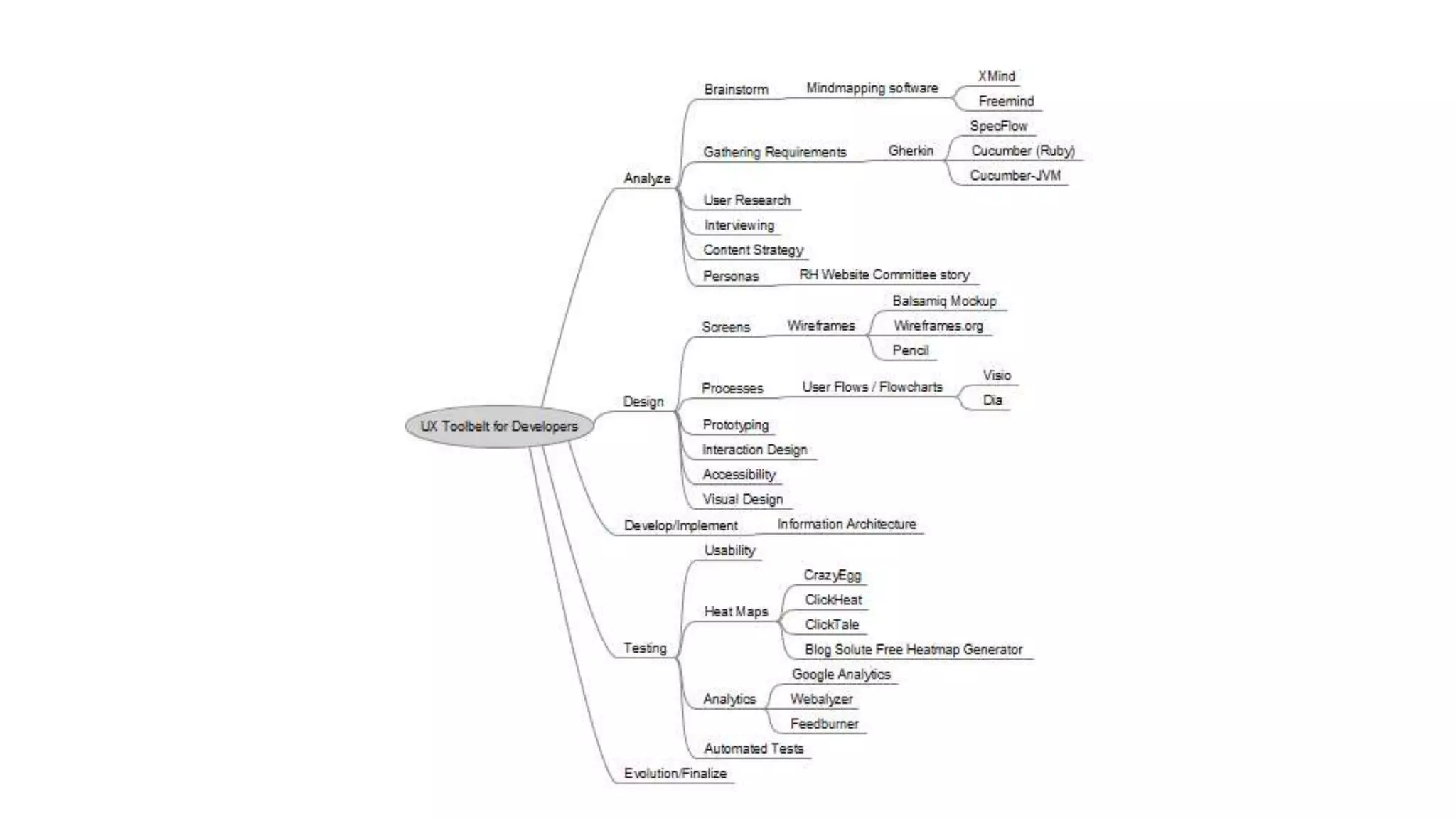The document discusses user experience (UX) design and how it relates to the software development process. It describes UX tools that can be used during each development phase, including mind maps, site maps, personas, user flows, wireframes, heatmaps and analytics. The goal is to involve UX design principles at every step to develop software that meets users' needs and provides a positive experience.