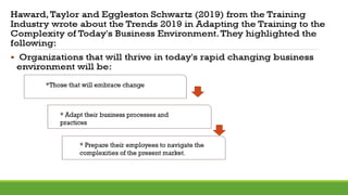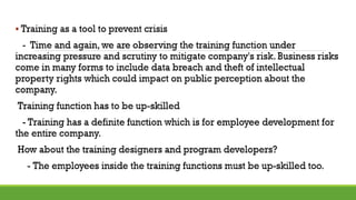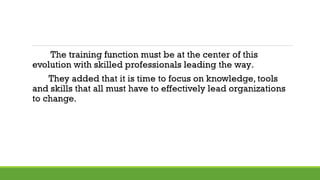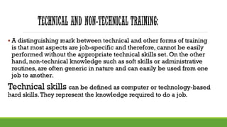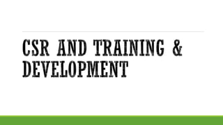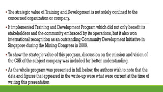 The document outlines the strategic value of training and development in organizations, emphasizing the importance of effective training programs for enhancing employee performance, promoting safety, and preparing for future manpower needs. It distinguishes between various types of training and delivery methods, detailing the planning, implementation, and evaluation phases crucial for a successful training initiative. The text also highlights the role of community development in relation to company operations, particularly addressing the needs of out-of-school youth and integrating corporate social responsibility within mining operations.