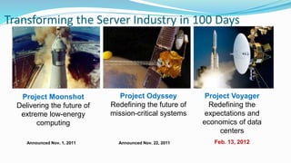 HP announced Project Voyager, a multi-year initiative to transform the server industry through innovation. As part of this, HP introduced the ProLiant Gen8 servers which include over 150 design innovations focused on improved manageability, energy efficiency, and reliability. ProLiant Gen8 servers provide advantages for both customers and HP partners such as increased performance, lower costs, and new revenue opportunities. Analysts and customers have praised ProLiant Gen8 for these benefits.