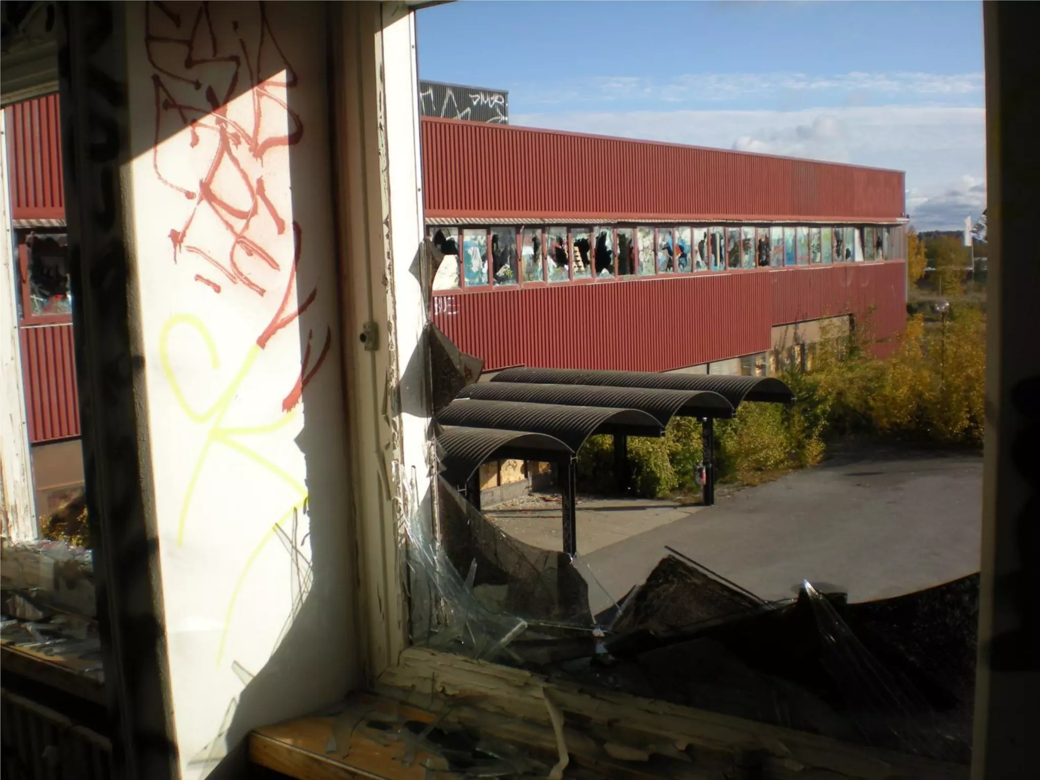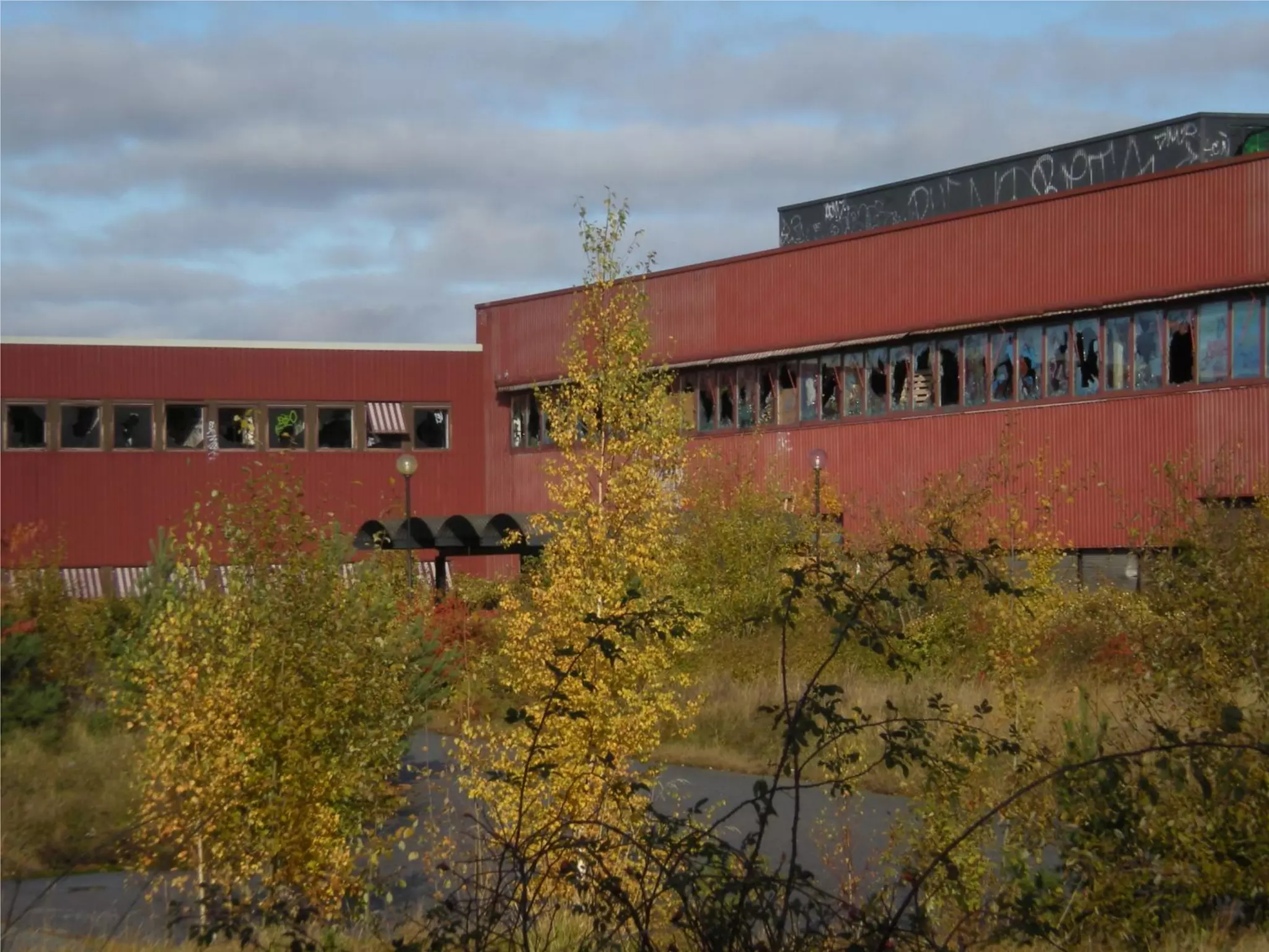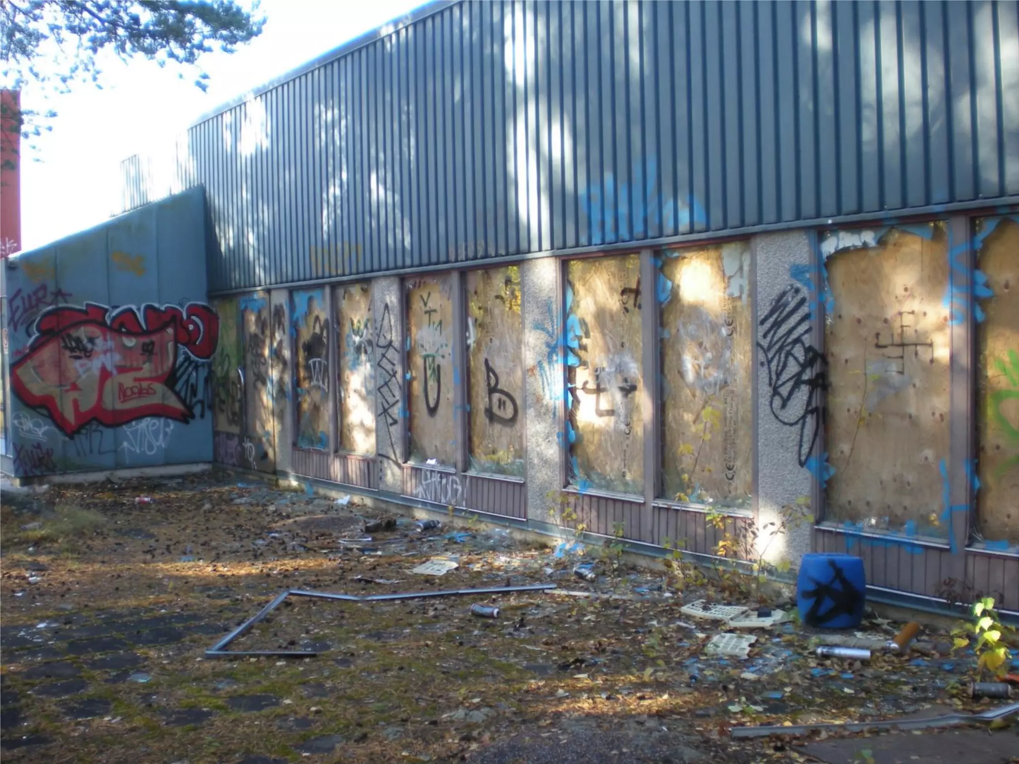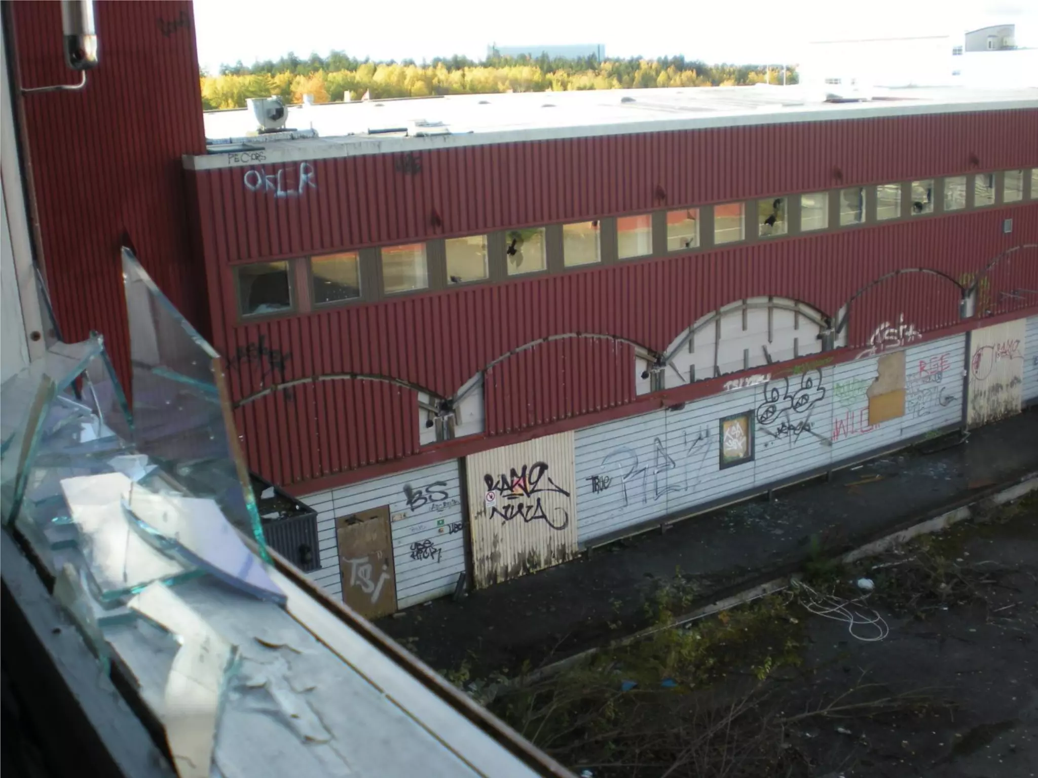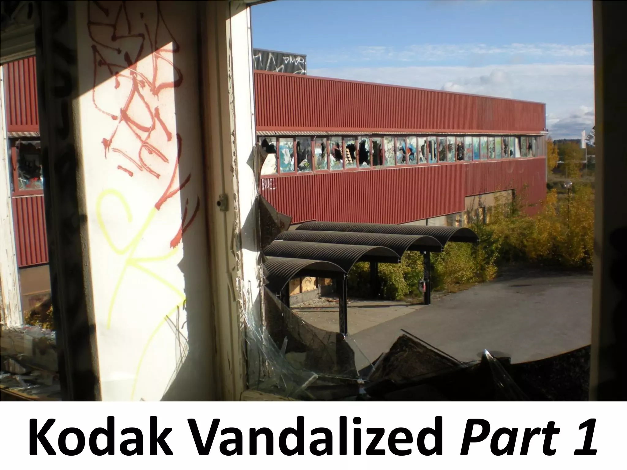 Kodak used to have a site outside Stockholm, Sweden that has since been vandalized and left in disrepair. The abandoned main building and surrounding area show signs of broken windows and graffiti, documenting the demise of the once prominent company. An artist added graffiti summarizing Kodak's fate on a small building next to the main site.