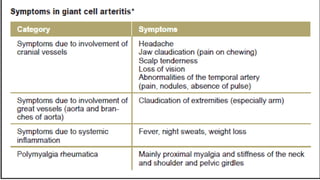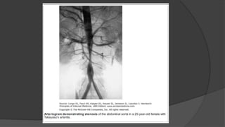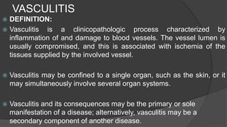 Vasculitis is inflammation of blood vessels that can affect single or multiple organ systems. It is classified based on the size of vessels involved - large, medium, or small. Common large vessel vasculitis includes giant cell arteritis and Takayasu arteritis. Pathogenesis involves immune complex formation, ANCA, and T lymphocyte responses. Clinical manifestations are variable and depend on organ systems involved. Diagnosis involves criteria based on symptoms, labs like ESR, and biopsy when possible. Treatment focuses on reducing inflammation and preventing complications.