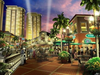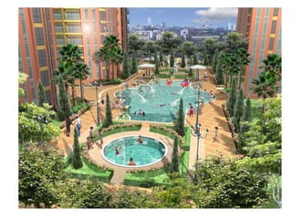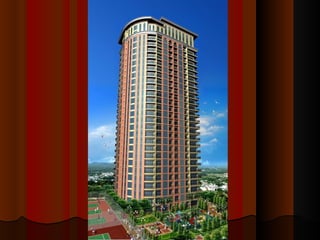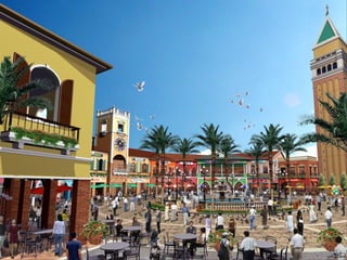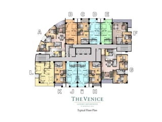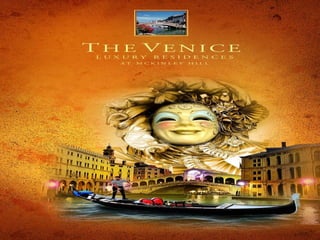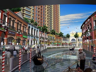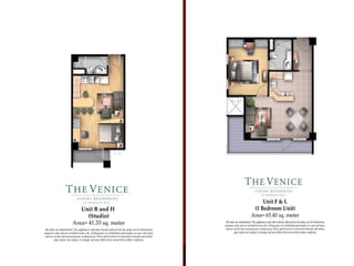 The document describes the features and amenities of residential properties called Bellini. It outlines the features of one, two, and three bedroom residences as well as executive studios, including things like modular closets, wood plank flooring, and kitchen cabinets. Common area amenities are also listed, such as gardens, pools, courts, and a security command center. Building facilities like automatic fire systems, generators, and maintenance services are highlighted. The development teams include architects, engineers, and landscape designers.