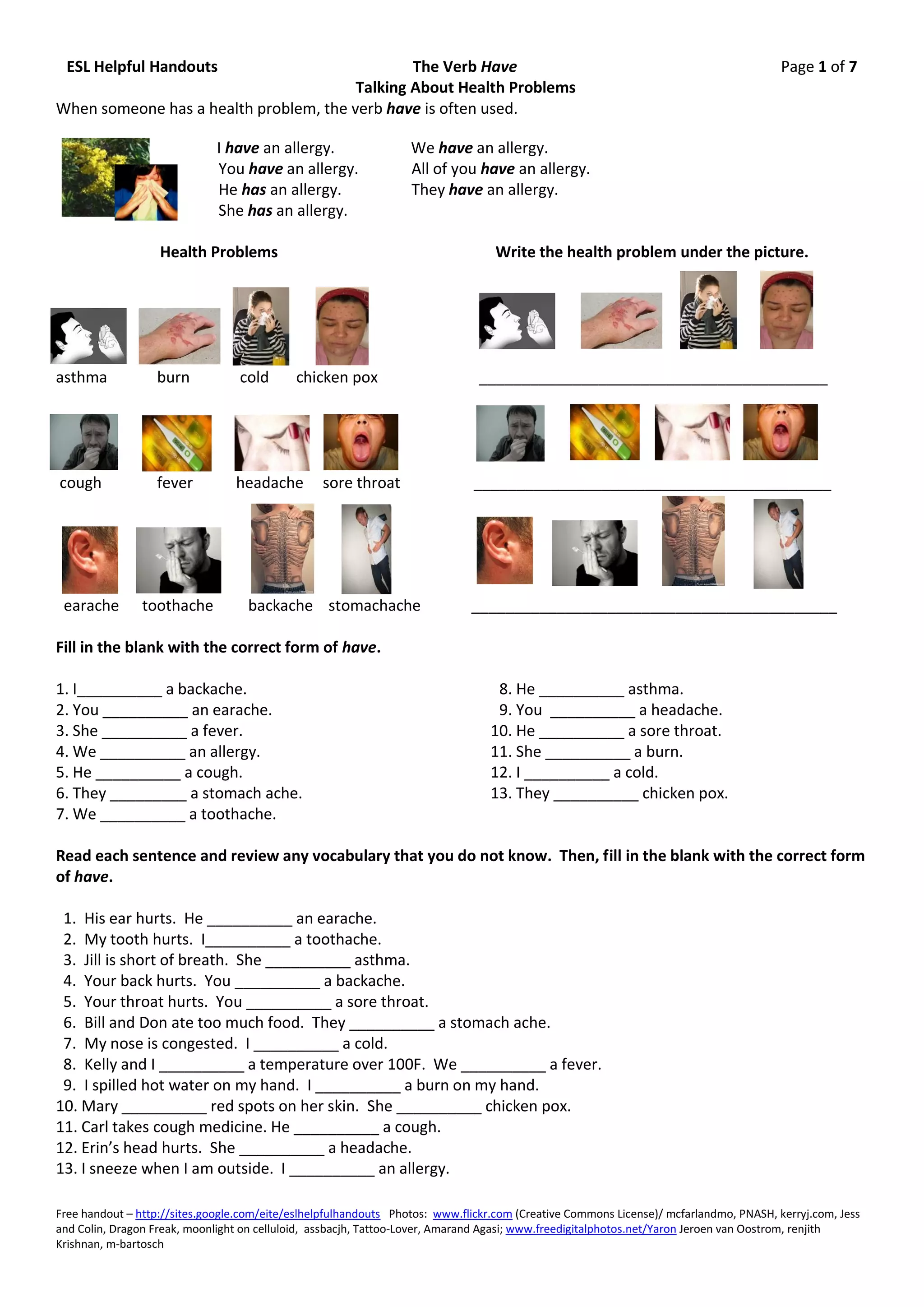 This document provides information about using the verb "have" to talk about health problems in English. It includes examples of sentences using "have" with different subjects and health issues. Pictures are included with labels for common health problems. The document also discusses forming questions using "have" and provides a card game to practice asking and answering questions about who has which health problem.