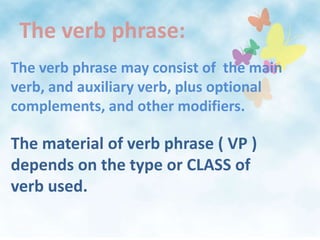 The document discusses different types or classes of verbs in English, including transitive verbs, intransitive verbs, ditransitive verbs, intensive verbs, complex-transitive verbs, prepositional verbs, and imperative verbs. For each verb type, it provides examples, rules for their verb phrases, and tree diagrams to illustrate their syntactic structure.