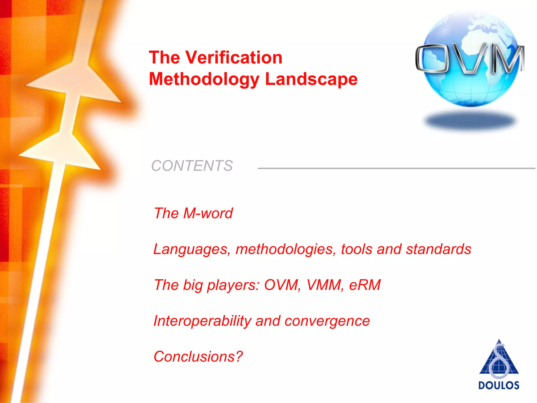 This document discusses verification methodologies like OVM, VMM, and eRM. It provides an overview of their key features such as constrained random stimulus, coverage-driven verification, and reusable verification environments. It also examines standards development efforts and looks at trends like growing adoption of verification IP and efforts to improve interoperability between methodologies.
