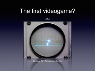 The document outlines the evolution of video games from the first cathode ray amusement device in 1947 to the Atari 2600 and NES, detailing key specifications and features. It discusses the architecture, performance, and capabilities of various gaming systems including the Atari 2600 and NES alongside notable games and their impact. Additionally, it touches on technological advancements and challenges faced in video game development during this era.