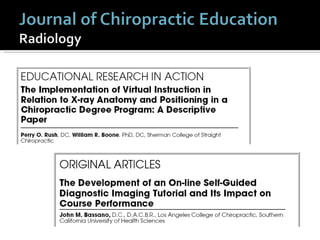 This document summarizes the use of educational technology in North American chiropractic institutions. It discusses surveys that were conducted of these institutions to understand their use of technologies like course management systems, online classes, and social media. The document also provides examples of specific technologies used at institutions like Northwestern Health Sciences University, including course management software, video technologies, and online case studies.