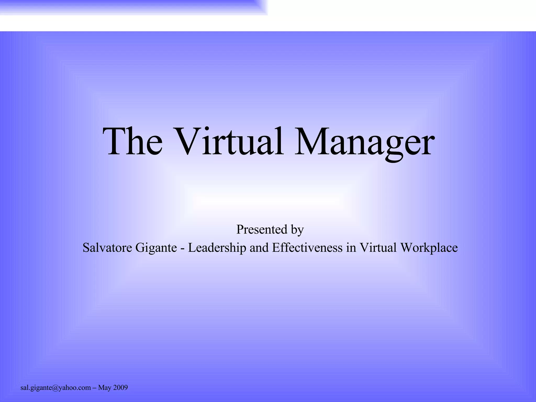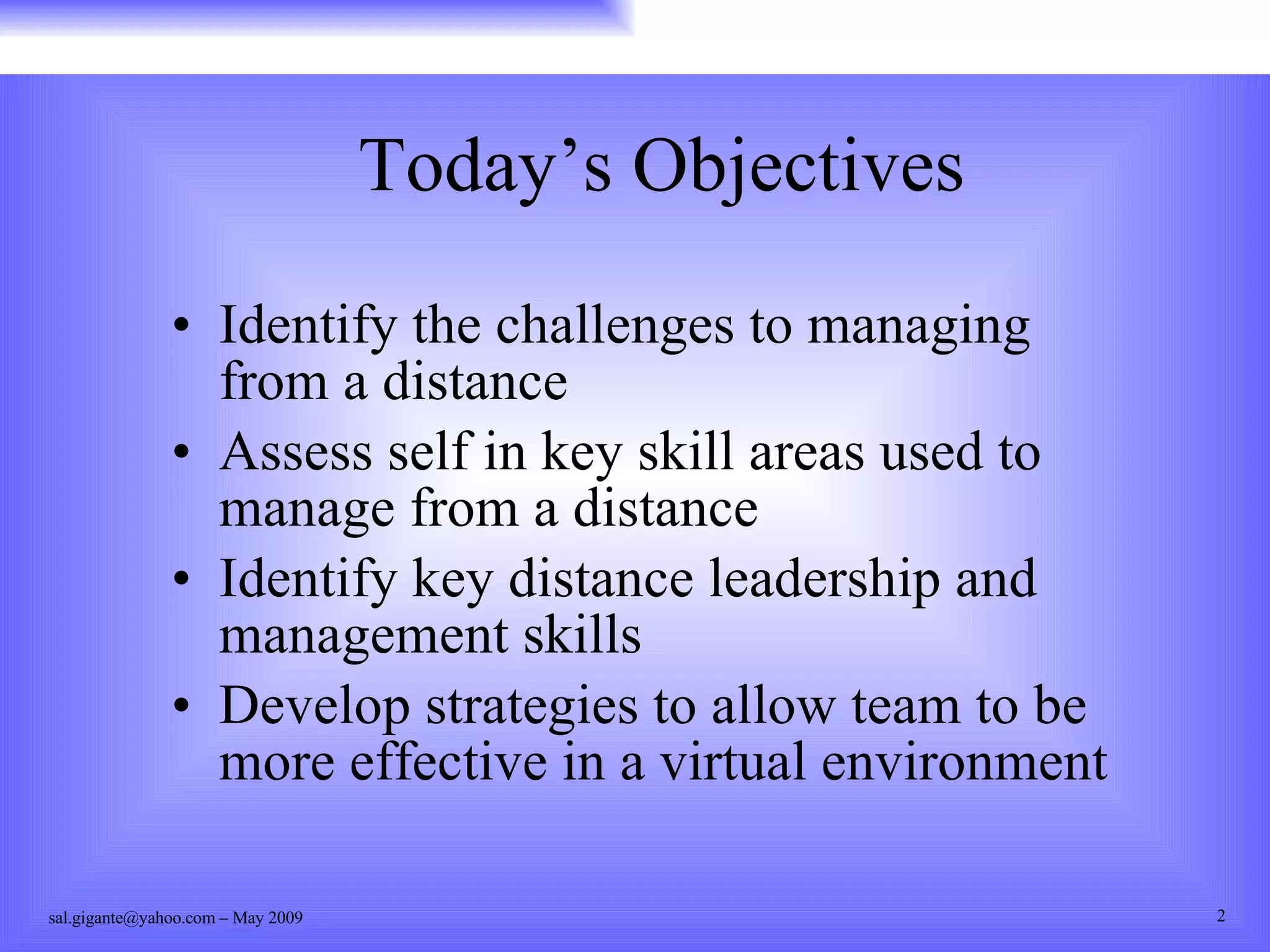 The document discusses the challenges of managing virtual teams from a distance and identifies key skills for effective virtual leadership and management. It notes that challenges are magnified when managing remotely compared to locally, as it is more difficult to monitor employees and motivate them at a distance. Effective skills for virtual management include providing strategic direction, strong communication, building relationships, setting goals, coaching, motivating employees, and providing feedback and support while managing by results rather than activity. The document provides tips for virtual team leadership, such as distributing work evenly, avoiding negative feedback by email, and being sensitive to different time zones.