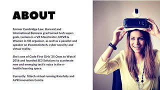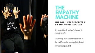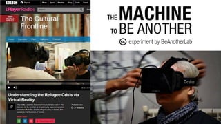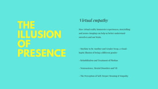 This document discusses the potential for virtual reality (VR) in various applications such as education, empathy, mental health, and research. VR allows users to feel truly present in virtual environments and feel connections to other people. It can be used to help people understand different cultures and perspectives. The document also describes several studies exploring using VR for medical training, treating depression and paranoia, and studying concepts like virtual body ownership.