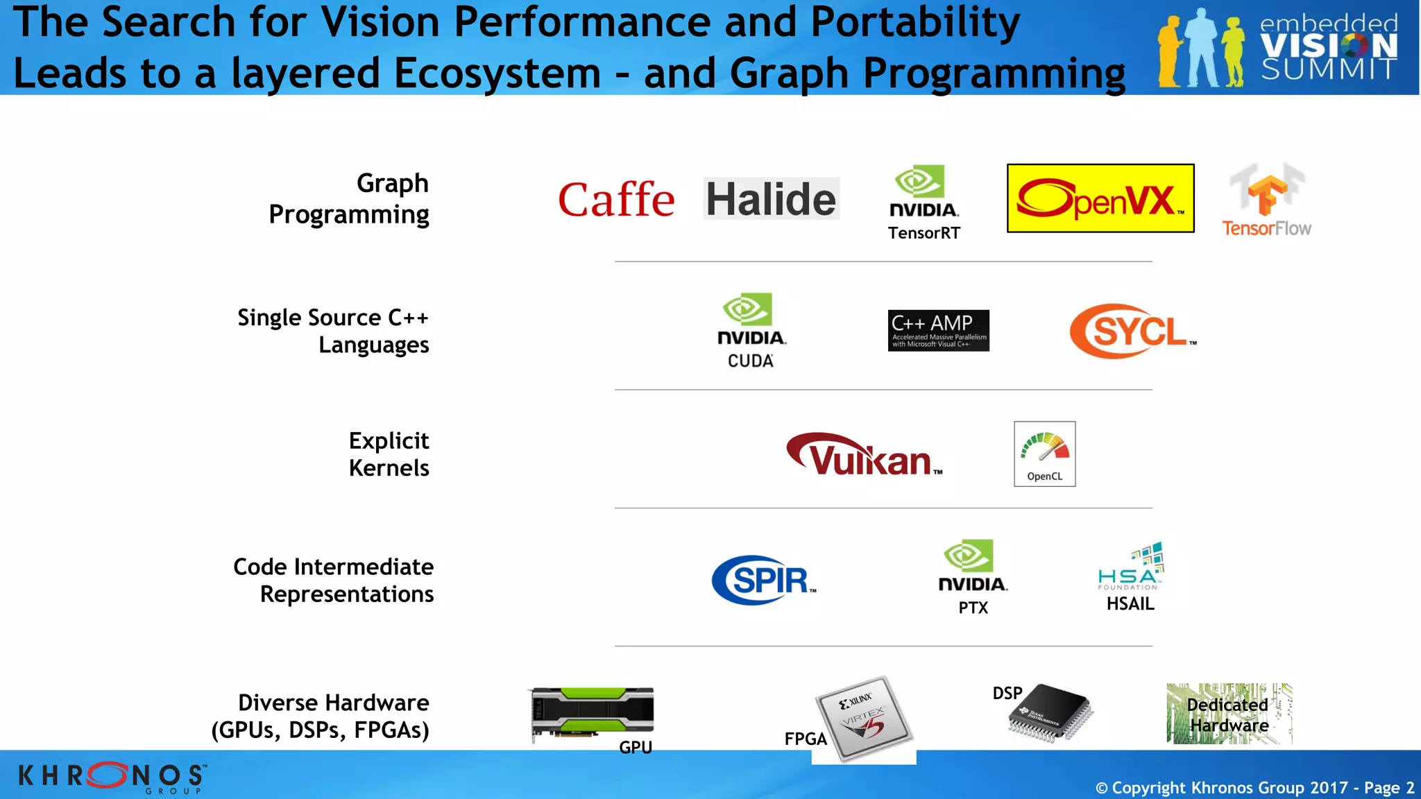 The document discusses the evolution and capabilities of the OpenVX framework for computer vision, focusing on its graph programming approach that enables efficient execution across various hardware platforms like GPUs, DSPs, and FPGAs. It describes enhancements in OpenVX versions and integration with the Neural Network Exchange Format (NNEF) for better neural network interoperability. Additionally, the document highlights the convergence of OpenVX and Vulkan, aiming for a more explicit control and flexibility in processing through the use of graphs and intermediate representations like SPIR-V.