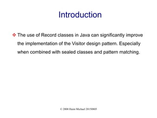 These slides were prepared for the online meetup that took place on Tuesday, June 3, 2025. During this meetup overviewed a new approach for implementing the visitor design pattern using pattern matching, sealed classes, and record classes.
