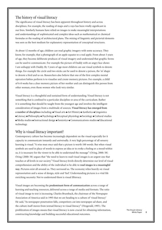 Visual literacy is the ability to understand and interpret visual images and to communicate using visual forms. It involves developing skills to analyze and interpret images within their cultural context, understand how images are constructed and can manipulate meaning, and produce visual communications. Teaching visual literacy is important because images pervade society and understanding visual messages is crucial for obtaining information and constructing knowledge in educational settings and everyday life. Strategies for developing visual literacy include exposing students to diverse images, teaching them to ask critical questions about images, and providing opportunities for students to experiment with creating and manipulating visual forms using technology.